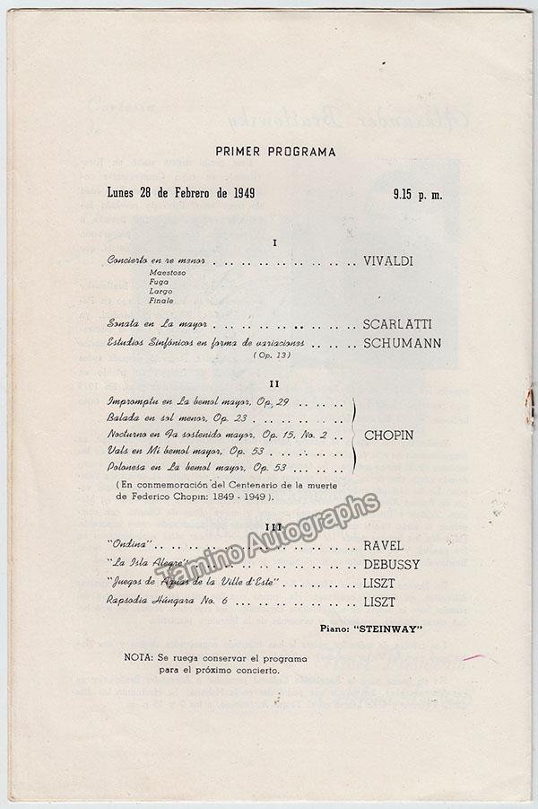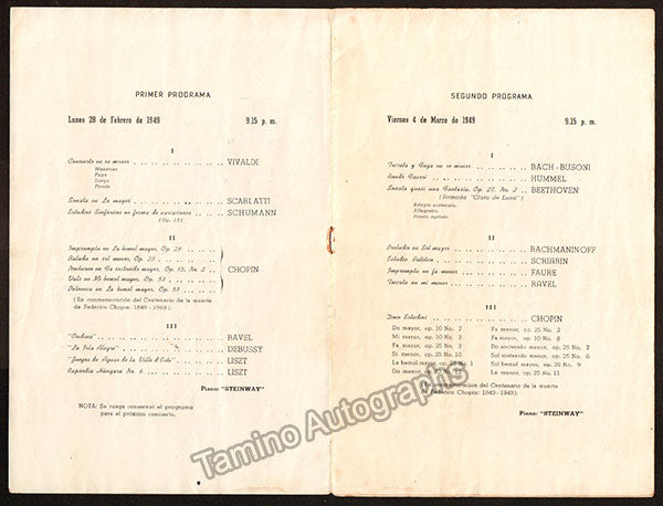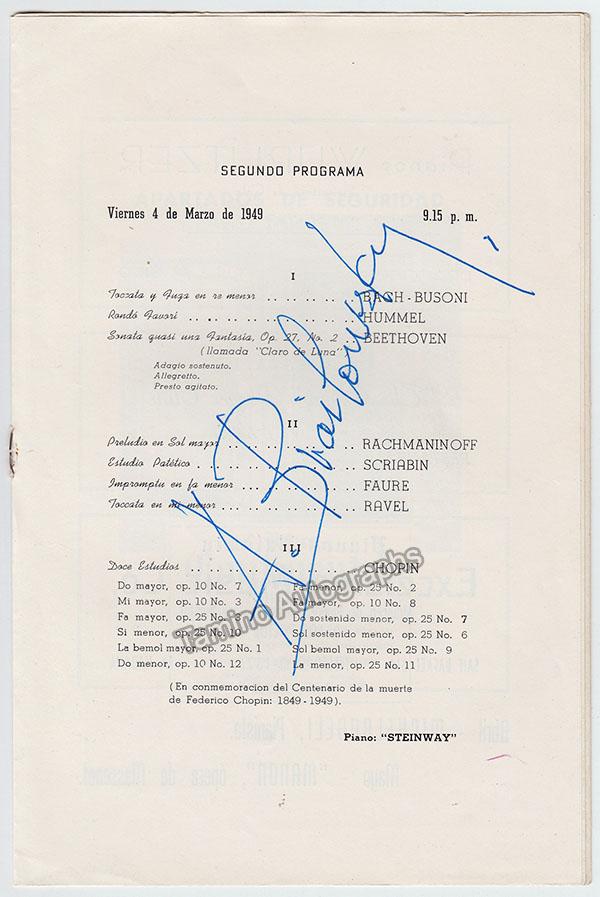 Program for a performance at Teatro Auditorium, Havana, Cuba, March 4th, 1949, commemorating the centennial of Chopin's death; signed by the pianist on the program page. Size is 6.25 x 9.3 inches, 8 pages (including covers), in very good condition.