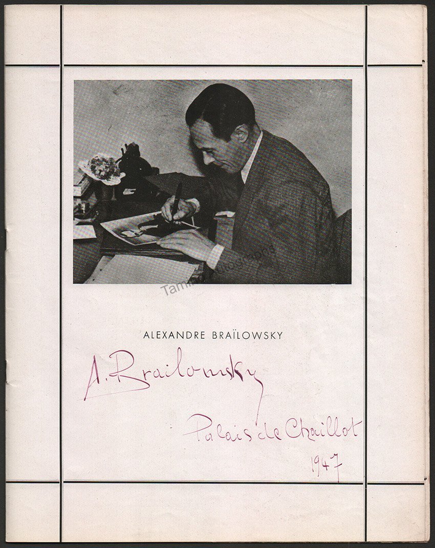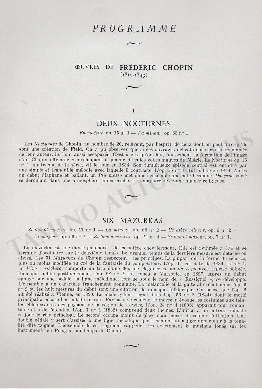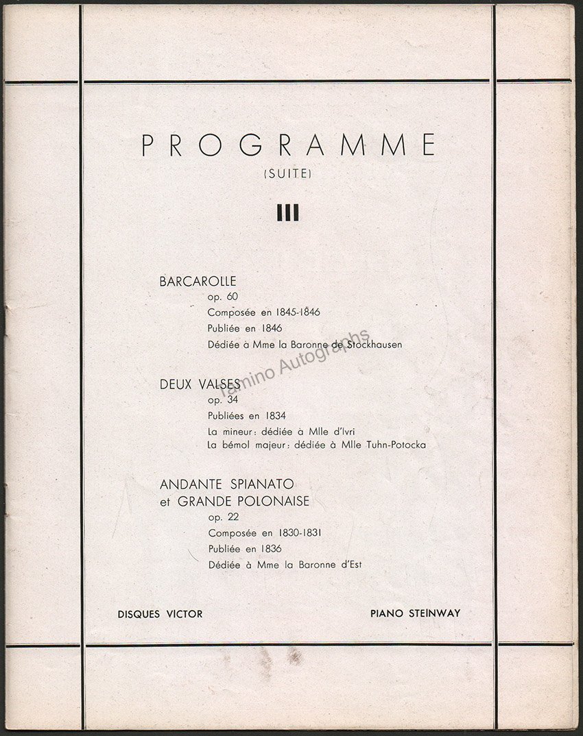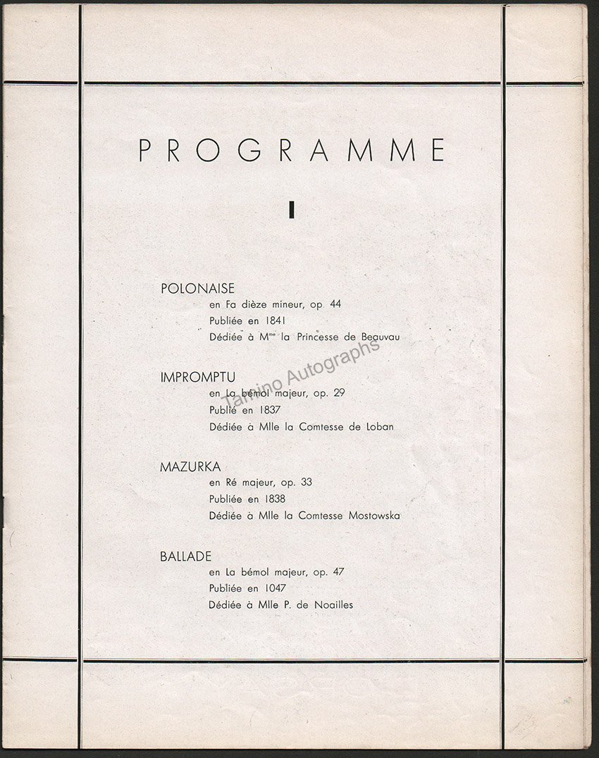 Program for an All-Chopin concert in Paris, May 13th, 1947, signed twice by him on different photo pages, inscribed. Size is 9.4 x 12 inches, some wear on edges, in overall very good condition.