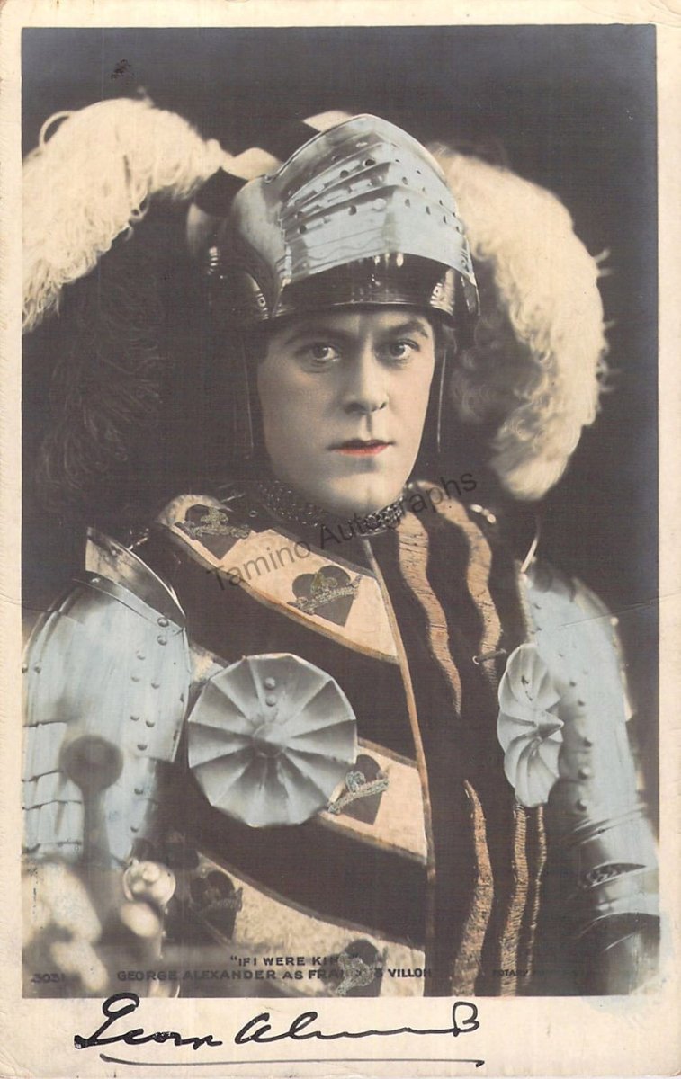 English actor (1858-1918). Beautiful colorized photo postcard signed by him, shown as Francois Villon. Size is 3.4 x 5.3 inches, minor silvering on edges, some rust on verso, otherwise in very good condition.