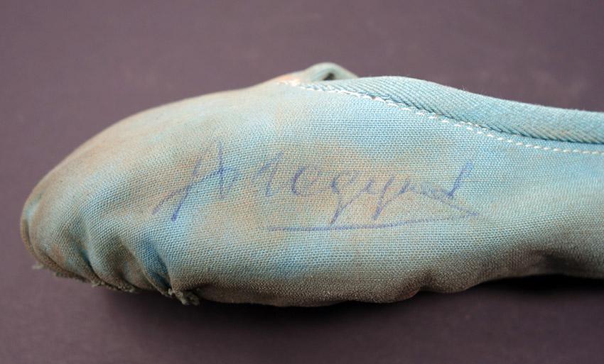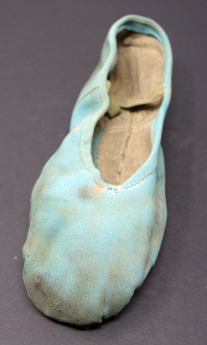 Signed single ballet slipper, worn in performance, light blue color, approx. 3.5 x 10 inches, in good condition.