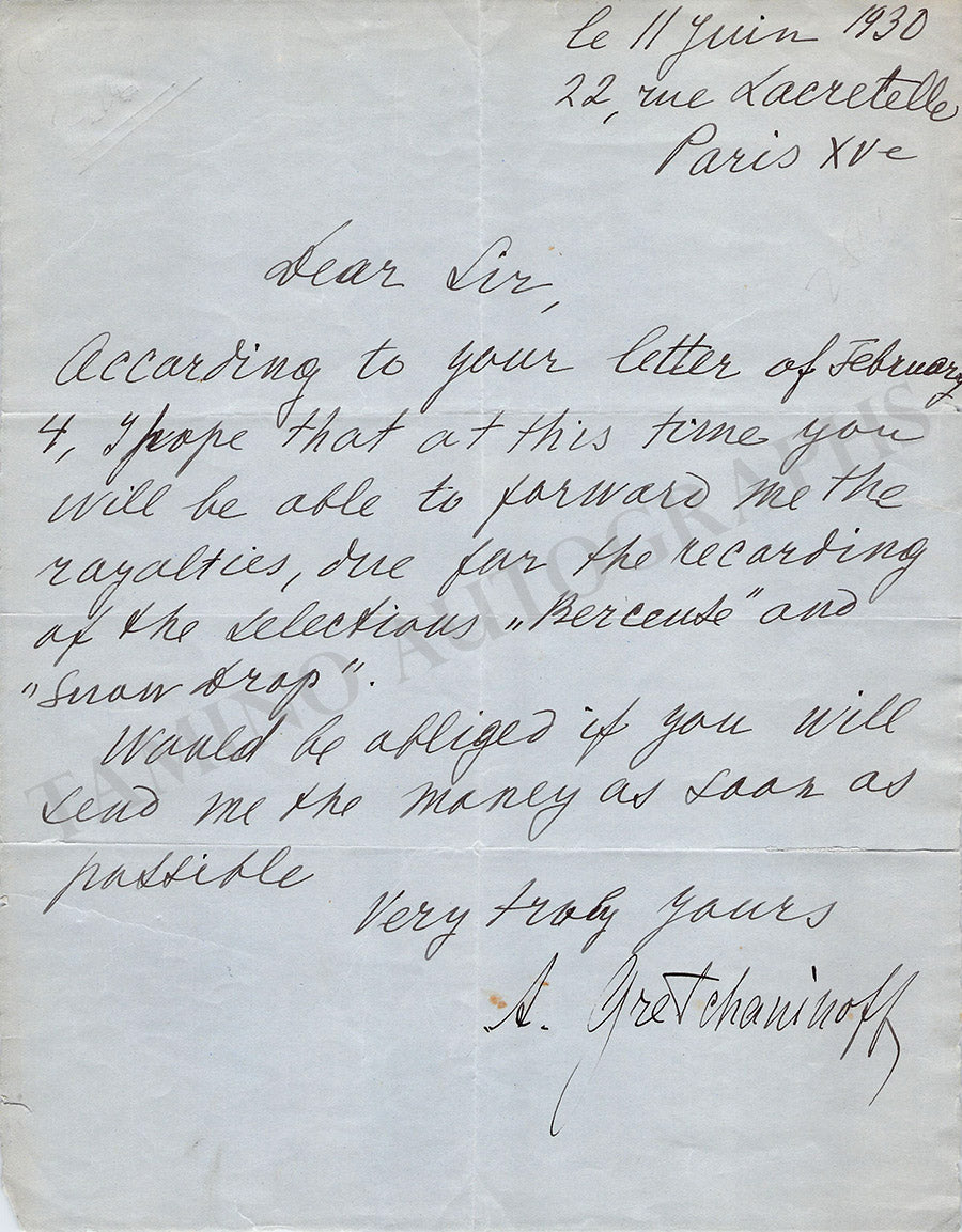 Gretchaninov, Alexander - Autograph Letter Signed 1930