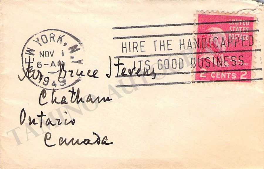 ALSO INCLUDED is a small signed card with a short greeting dated 1949 (plus its original envelope) AND a black-and-white photograph inscribed with a sentiment by him dated in New York, 1949 (facsimile signature).