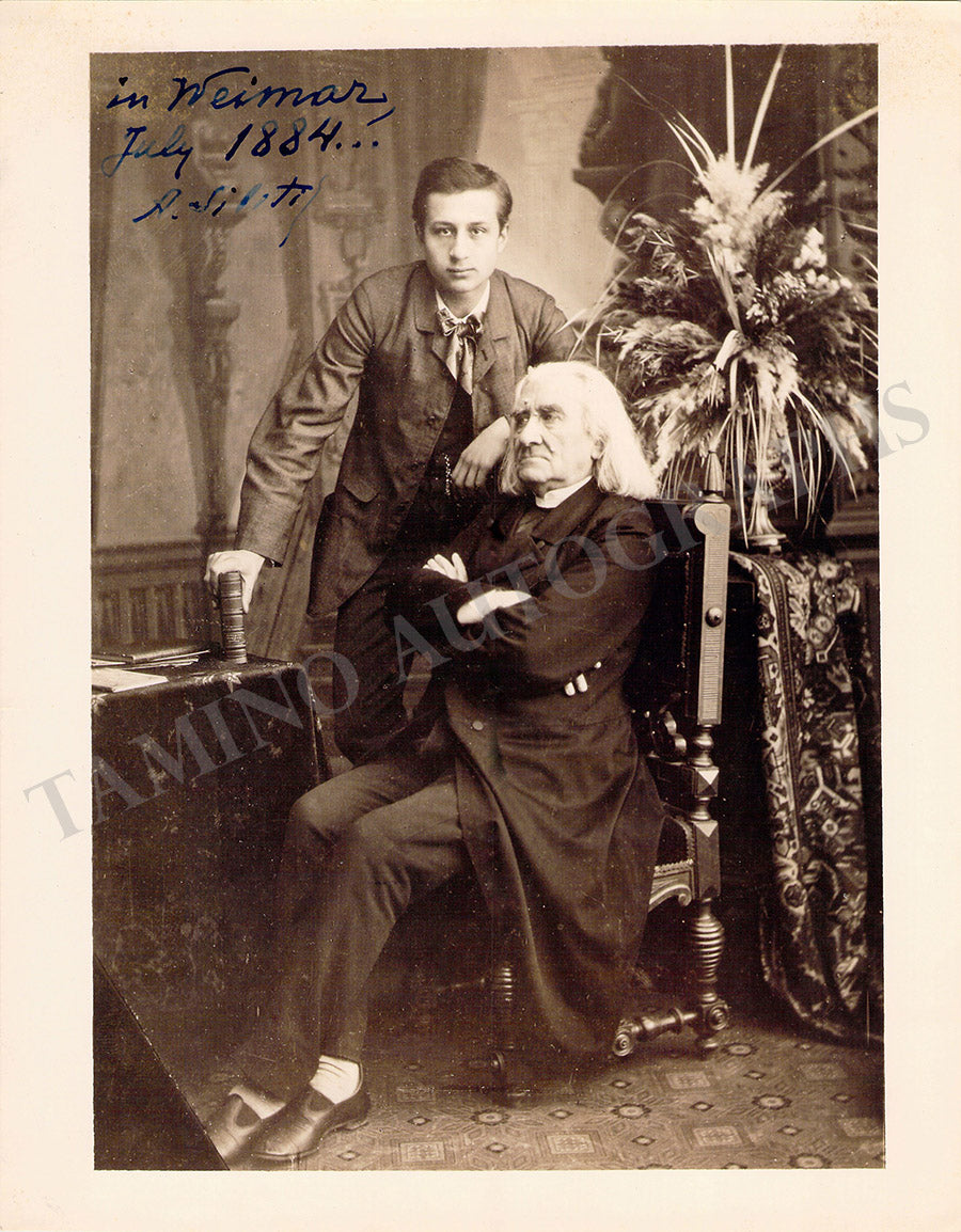 Modern print of an old photograph shown next to Franz Liszt signed by Siloti dating the occasion of the photo in Weimar, July 1884, when he was just 21. Size is 7.9 x 10.1 inches, in very good condition.