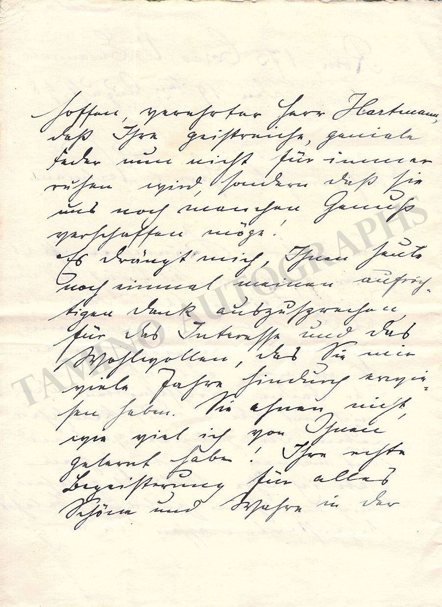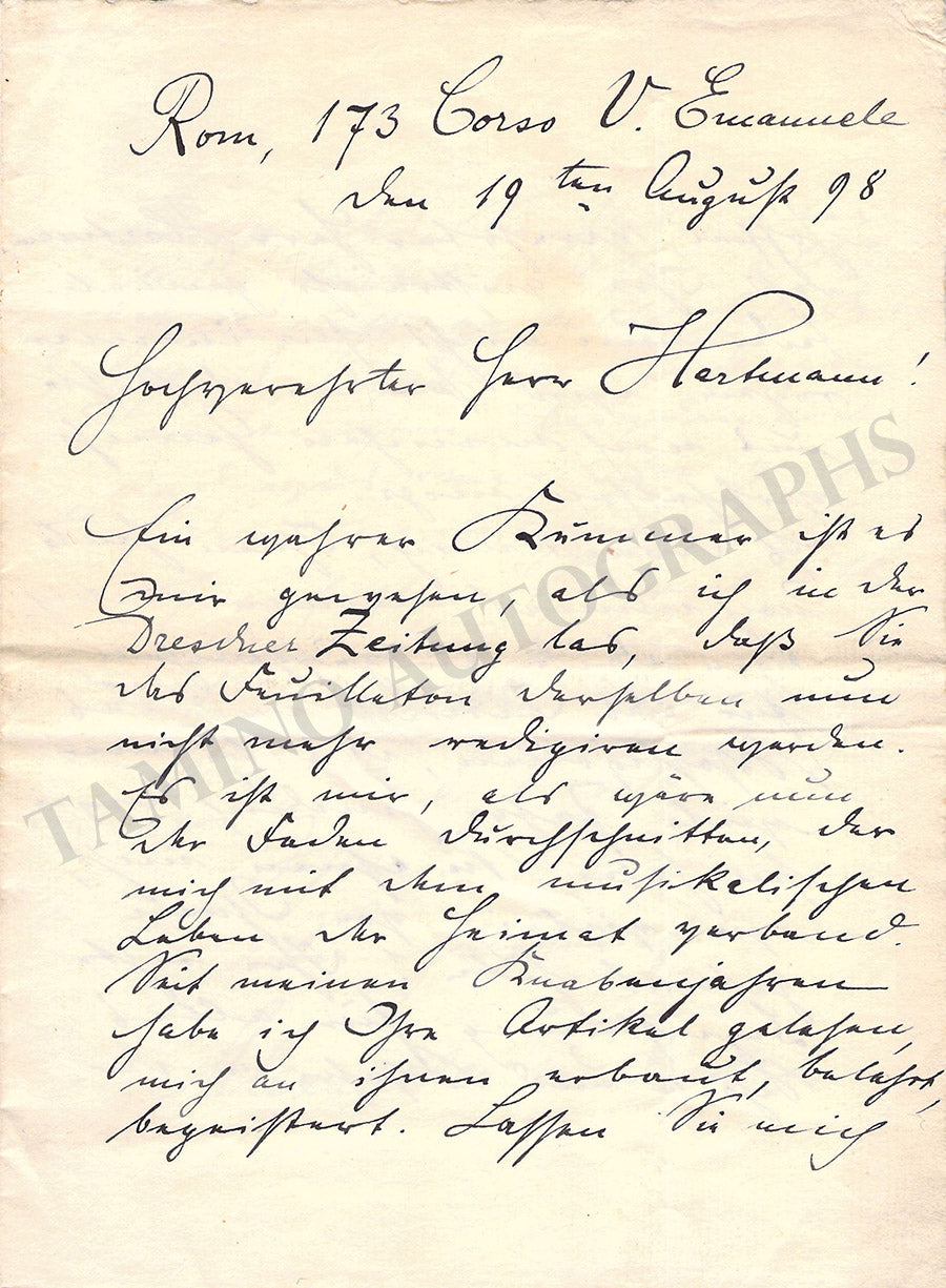 Autograph letter in German signed by him, dated August 19, 1898, addressed to a music critic, concerning articles he published. Size is 6.2 x 8.5 inches, 3 written pages, central fold, overall rust tone, in very good condition.