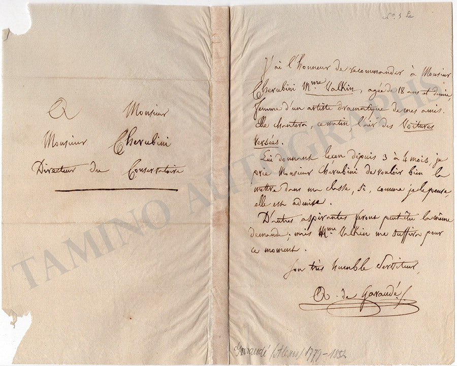 Autograph letter in French signed by him, no date, addressed to the famous French composer Luigi Cherubini: “J’ai l’honneur de recommander à Monsieur Cherubini M.me Valkin, âgée de 18 ans et demie, femme d’un artiste dramatique de mes amis. Elle chantera, ce matin, l’air des Voitures versées [François-Adrien Boïeldieu, 1775-1834]. Lui donnant leçon depuis 3 à 4 mois, je prie Monsieur Cherubini de vouloir bien la mettre dans une classe, si, comme je le pense, elle est admise…”.