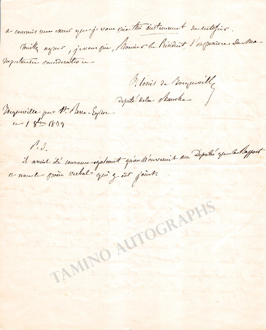 Tocqueville, Alexis de - Autograph Letter Signed 1839 - Tamino Tocqueville, Alexis de - Autograph Letter Signed 1839 - Tamino
