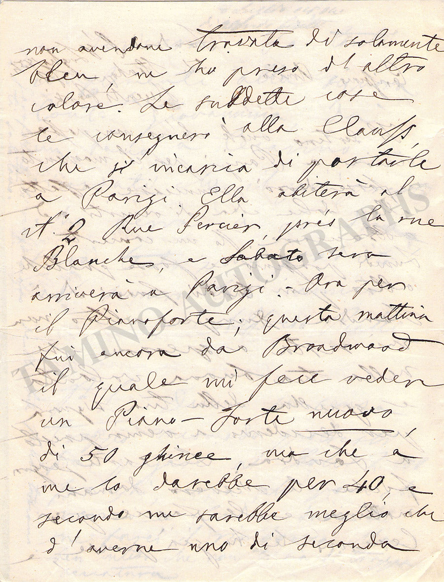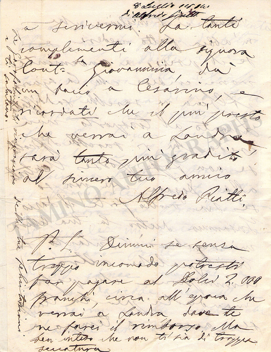 Autograph letter signed by him, in Italian, sold with translation and transcription, dated in London, July 8, 1854, to a friend about the personal and music business. Size is 5.4 x 7 inches, 4 written pages in one folded sheet, in very good condition.