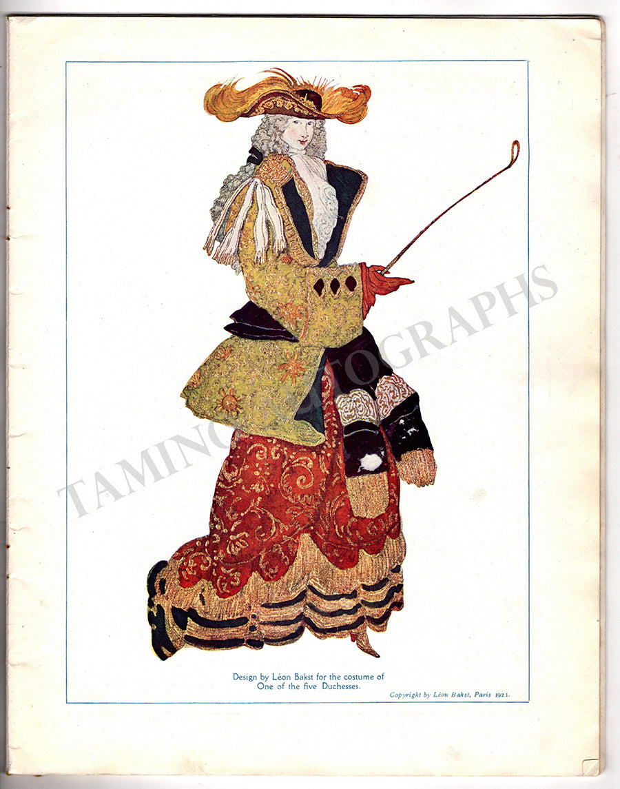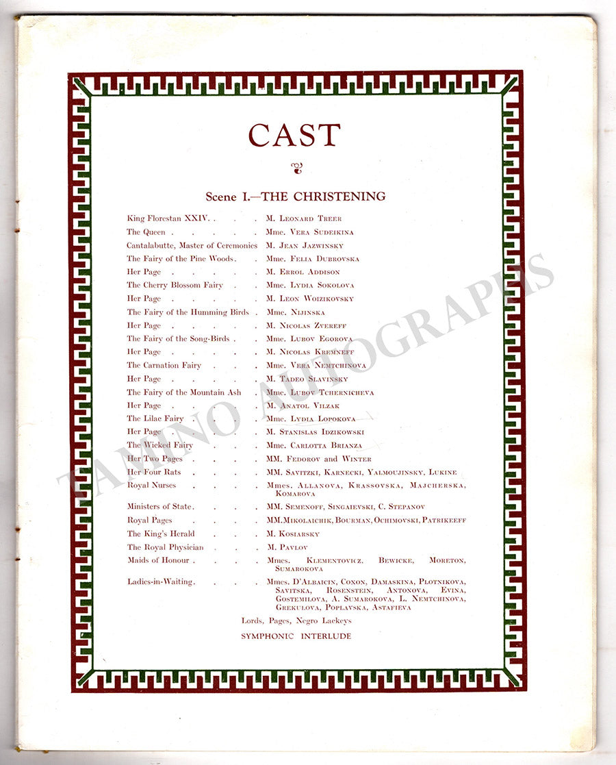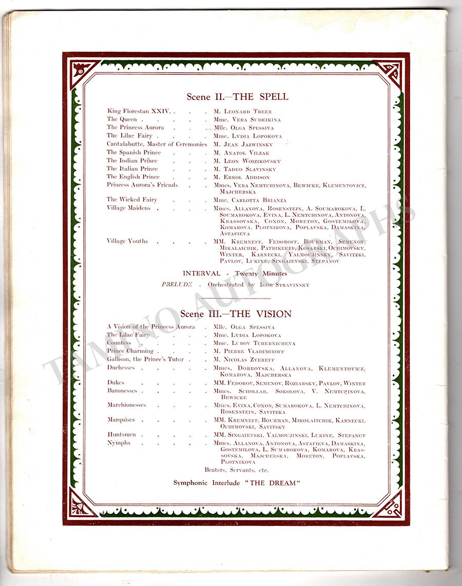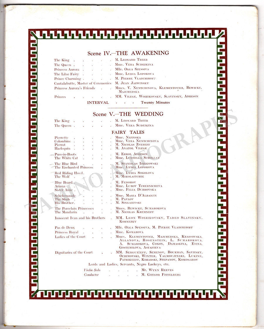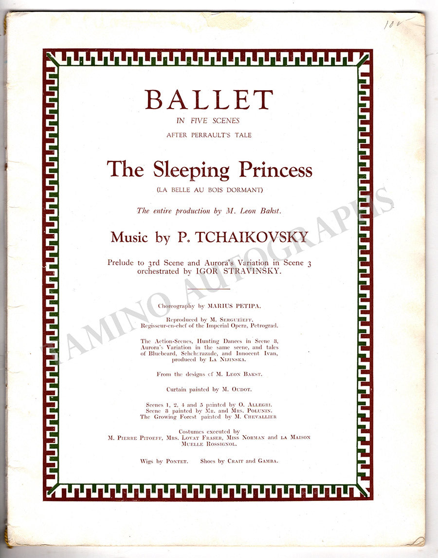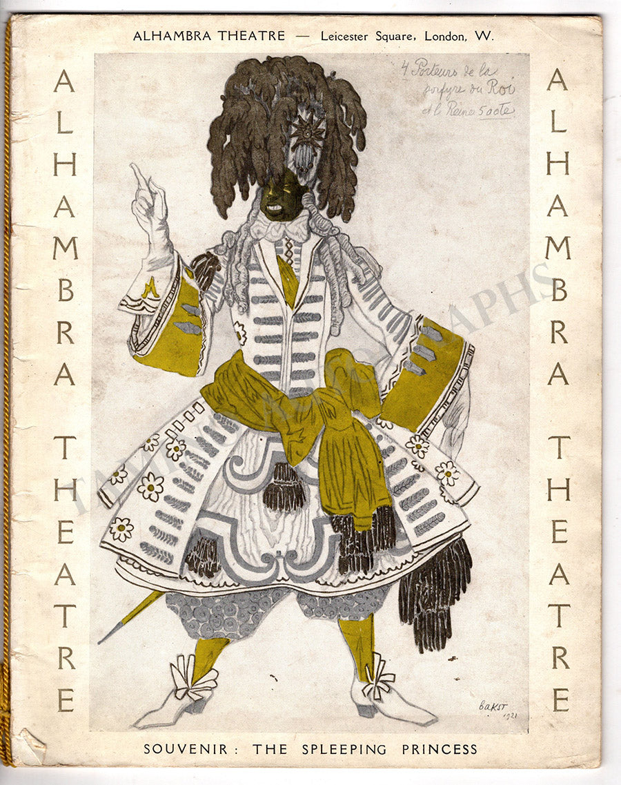 Program for a performance of Tchaikovsky's ballet "The Sleeping Beauty" at Alhambra Theatre, London, in 1920, produced by Leon Bakst, featuring star ballerinas featuring Lydia Sokolva, Bronislava Nijinska, Vera Nemtchinova, and others.