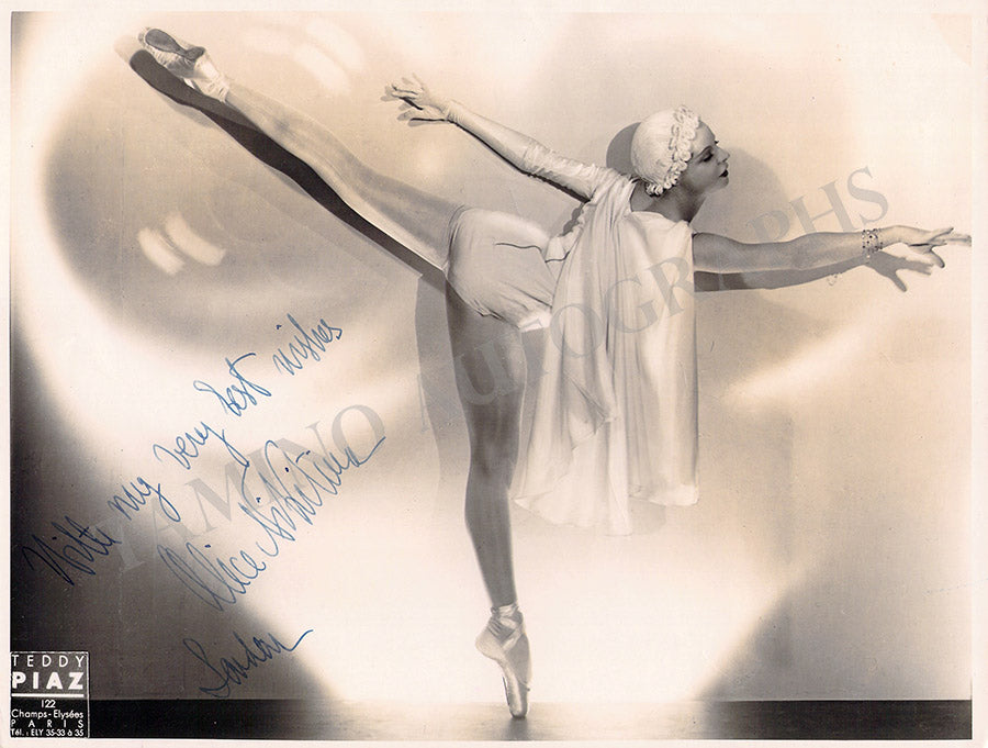 Beautiful black-and-white photograph signed by her with a short sentiment, shown in performance; a photo by Teddy Piaz, Paris. Size is 9.1 x 6.9 inches, mounting traces on verso, in very good condition.