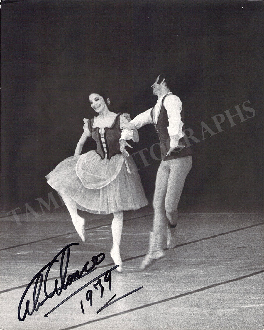 Beautiful black-and-white photograph signed by her dated 1979, shown in performance; ink-stamped on verso by photographer Louis Peres. Size is 7 x 10 inches, in excellent condition.