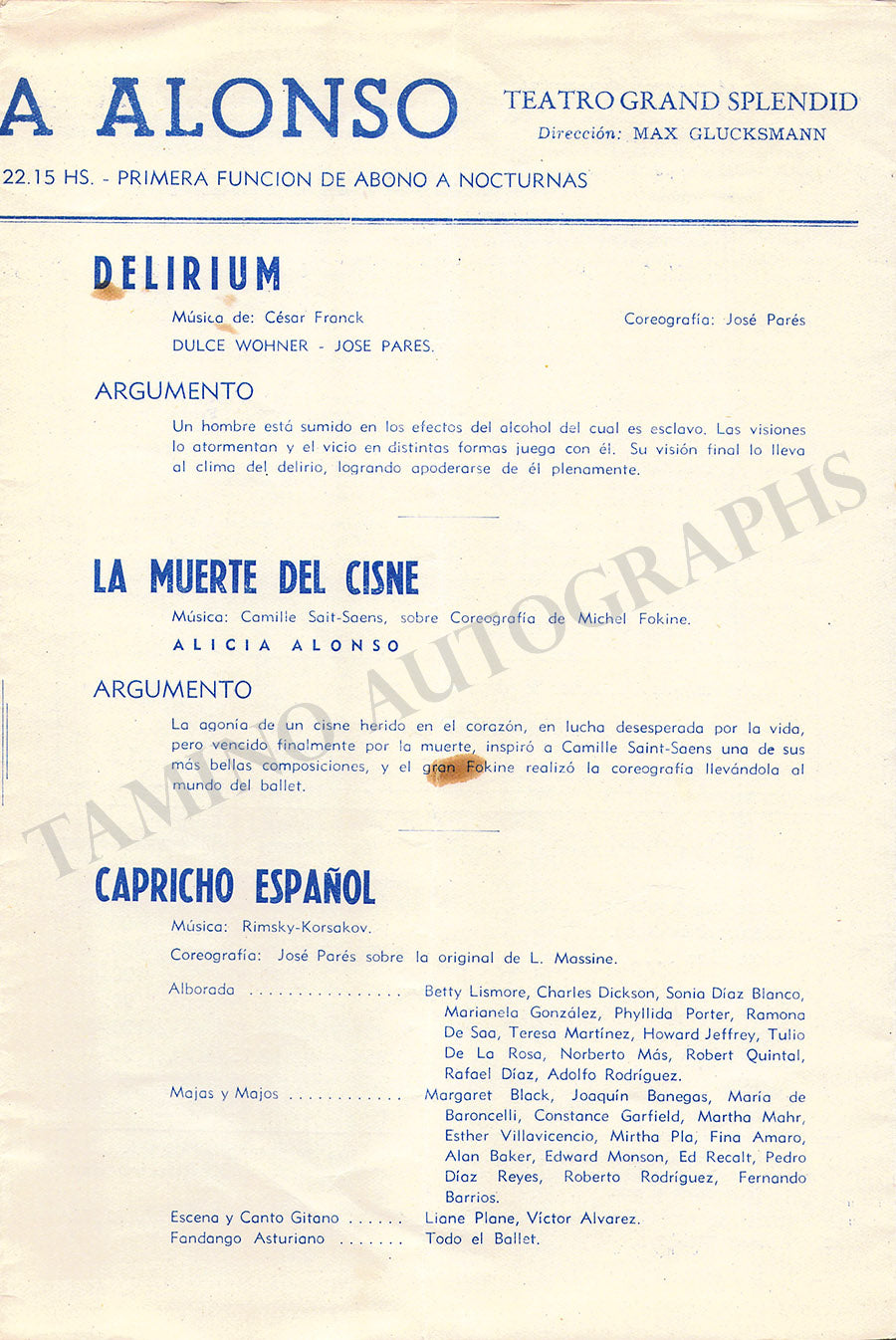 Playbill for a performance of the Alicia Alonso Ballet at the Grand Splendid Theater, Buenos Aires, signed by her and by her fellow dancer Carlota Pereyra. Size is 6.25 x 9.3 inches, tetrafold, some wear, in very good condition.