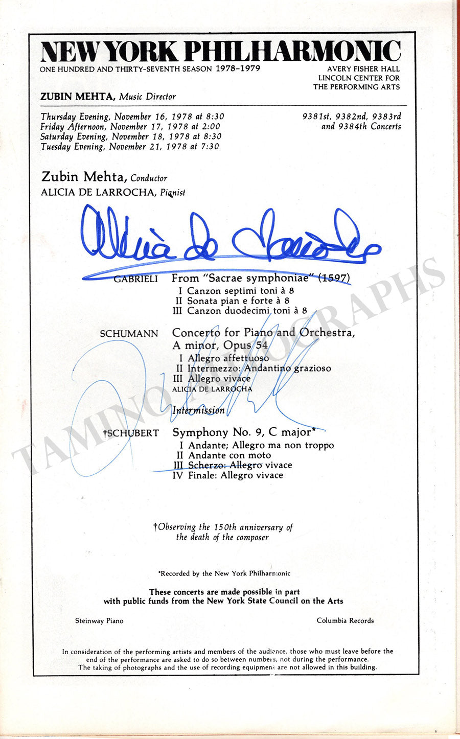 Original program for a concert at Avery Fisher Hall, New York, November 1978, for a performance of Schumann's Piano Concerto by the celebrated pianist Alicia de Larrocha with the New York Philharmonic under Zubin Mehta; signed by De Larrocha and Mehta in the program page.