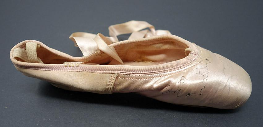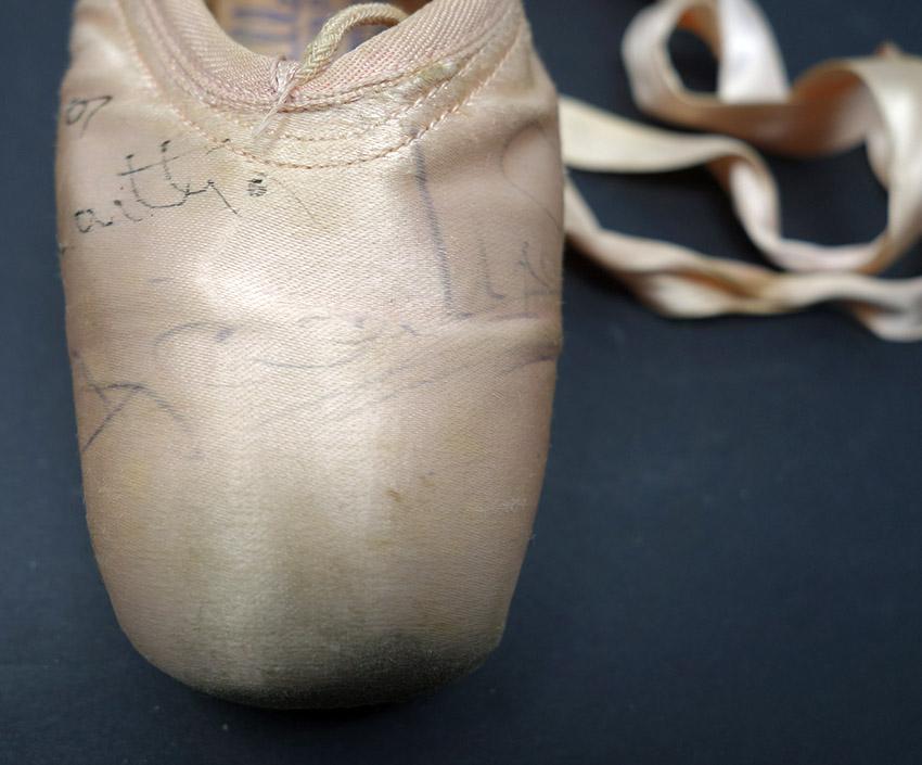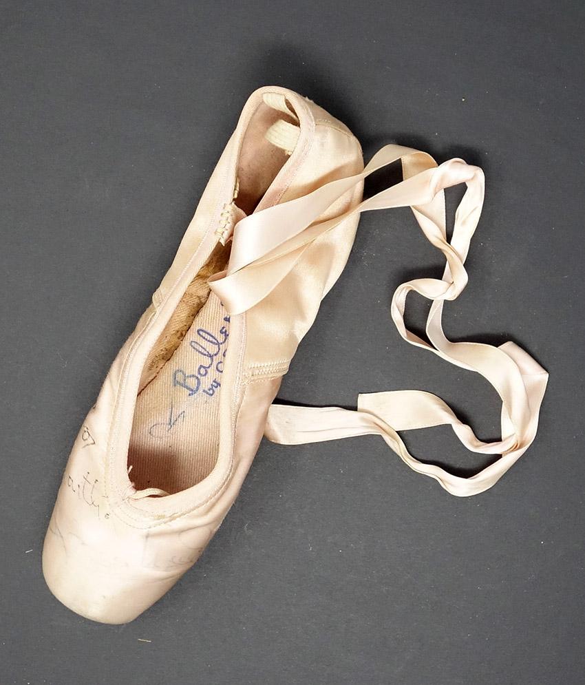 Signed single pointe shoe, worn in performance, inscribed, signature is over the toe area, faded but still visible, 2.25 x 8.25 inches, in good condition.