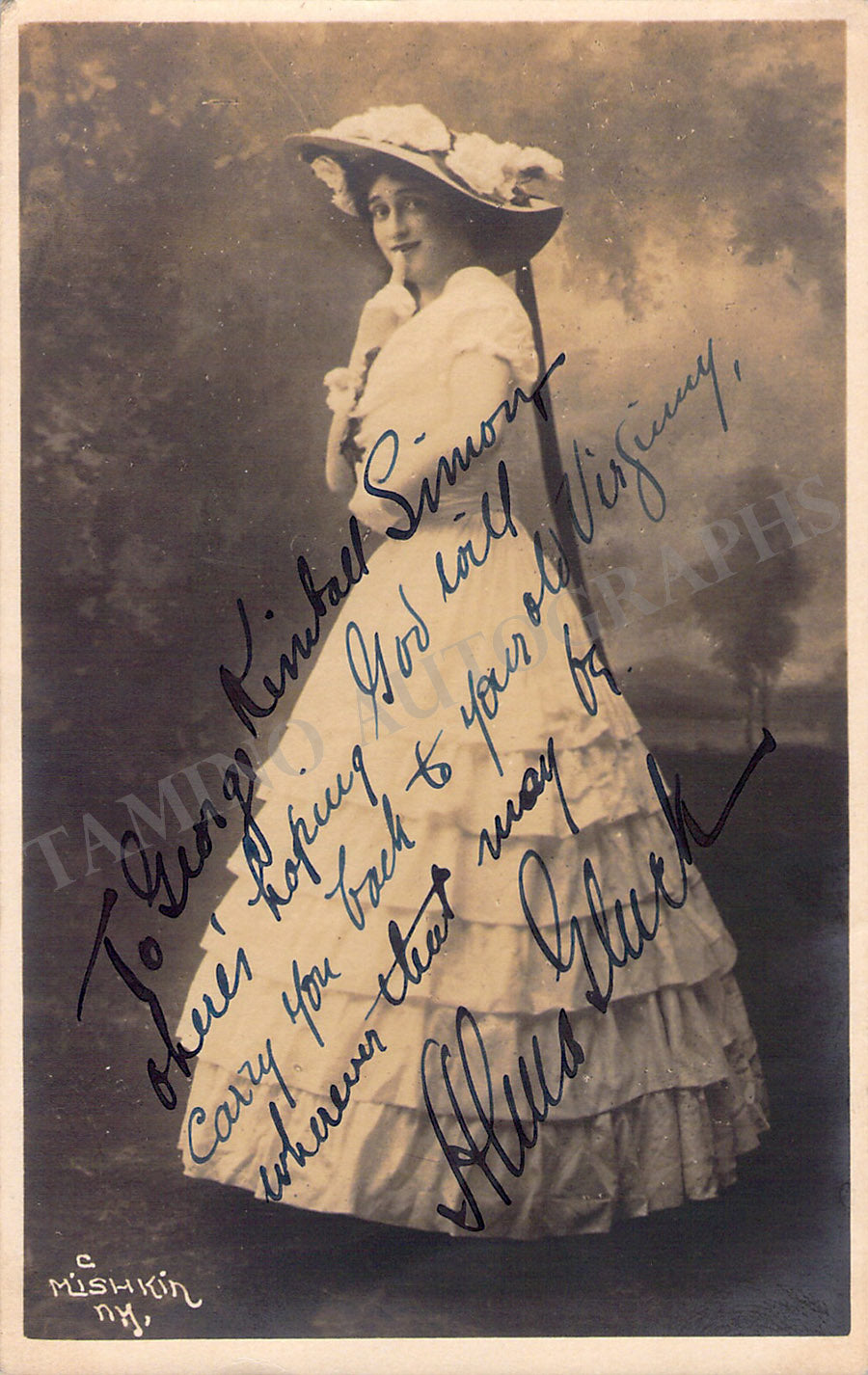Fine black-and-white photo postcard signed and inscribed by her with a long sentiment; a photo by Mishkin (New York). Size is 3.3 x 5.3 inches, in excellent condition.