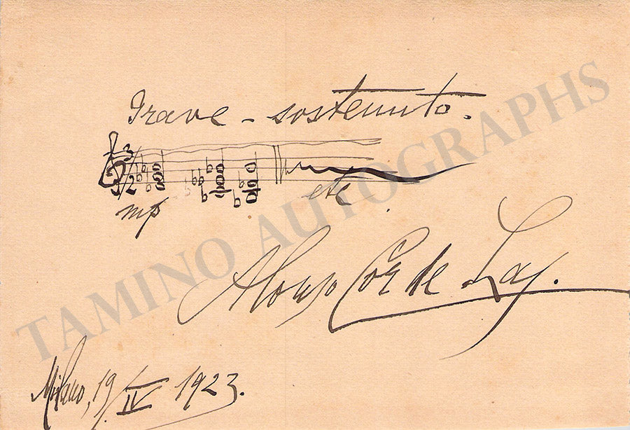 1-bar autograph music from probably one of his works, signed by him and dated in 1923.  Size is 6.7 x 4.6 inches, folds, in excellent condition.