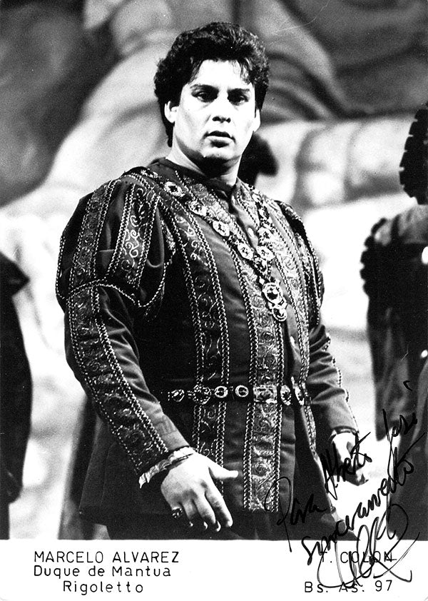 Signed photograph, shown as the Duke of Mantua in Verdi's Rigoletto at the Teatro Colon, Buenos Aires, inscribed. Stamped on verso by photographer Arnoldo Colombaroli, Teatro Colon. Size is 5 x 7 inches, in excellent condition.