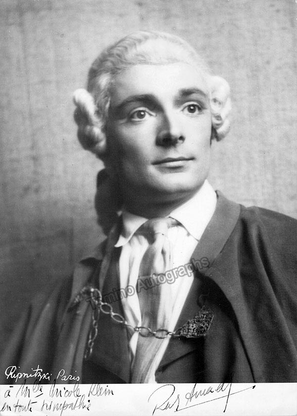 French tenor (1915-1969), signed photo, shown as Count Almaviva in Rossini's Barbiere di Siviglia. Inscribed. Blind stamped on front and stamped on verso by photographer Litpnitzki, Paris. Size is 5 x 7 inches, slight crease on top left and wear on edges but otherwise in good condition.