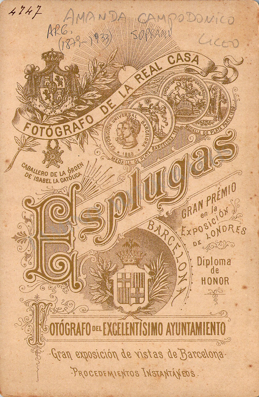 Original cabinet-style vintage (unsigned) photograph of the Argentine singer by photographer Antoni Esplugas (Barcelona). Size is 4.25 x 6.5 inches, spotted rust stains on the front, verso with some ink markings, otherwise in excellent condition.
