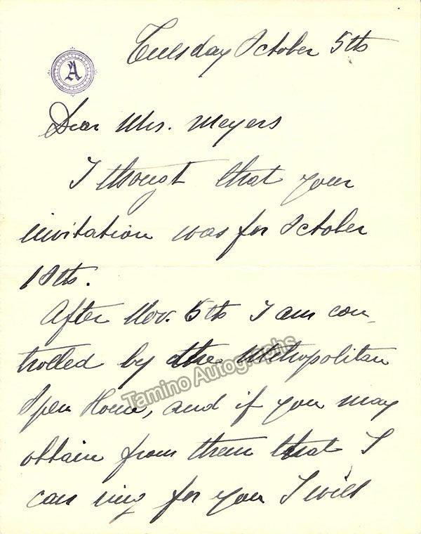 Italian baritone (1878-1942) who enjoyed an international reputation and sang for 13 years at the Metropolitan Opera. Autograph letter signed, 2 pages of text on a folded 4 page document with embossment on front page, written in English. Size of each page is 5 x 6.5 inches, fold in center, in excellent condition. ALSO INCLUDED: unsigned photo, shown as himself with printed signature on front of photographer C. Mishkin, New York. Size is 4.5 x 8 inches, with a small cut on bottom right and slight paper loss on top left, along with mounting traces on verso, otherwise in good condition. Not sold separately.
