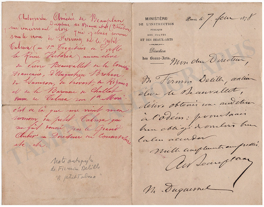 Autograph letter in French (untranslated) signed by her, dated in Paris, February 7, 1878, addressed to the director of the Théâtre de l'Odéon Félix Duquesnel (1832-1915), concerning the pupil Firmin Delille: "...ancien élève de [Pierre-François] Beauvallet, désire obtenir une audition à l'Odéon...". At the fourth page, autograph note by Delille concerning de Beauplan.