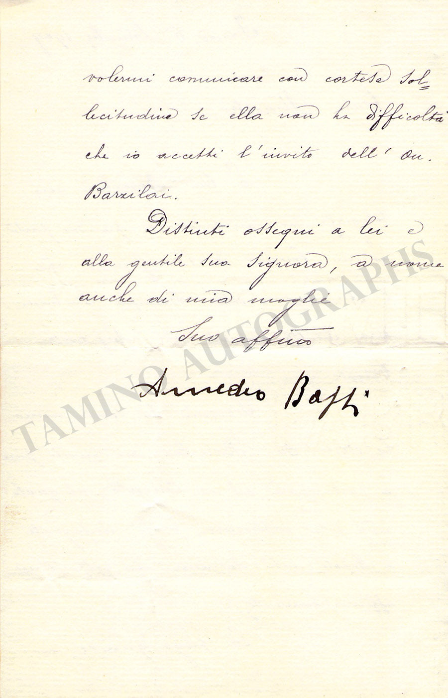 Letter addressed to Pietro Mascagni written by a different hand but signed by Bassi dated in Florence, 1909, where he mentions an invitation to sing in a concert. Size is 4.4 x 6.9 inches, 2 written pages, in overall very good condition.