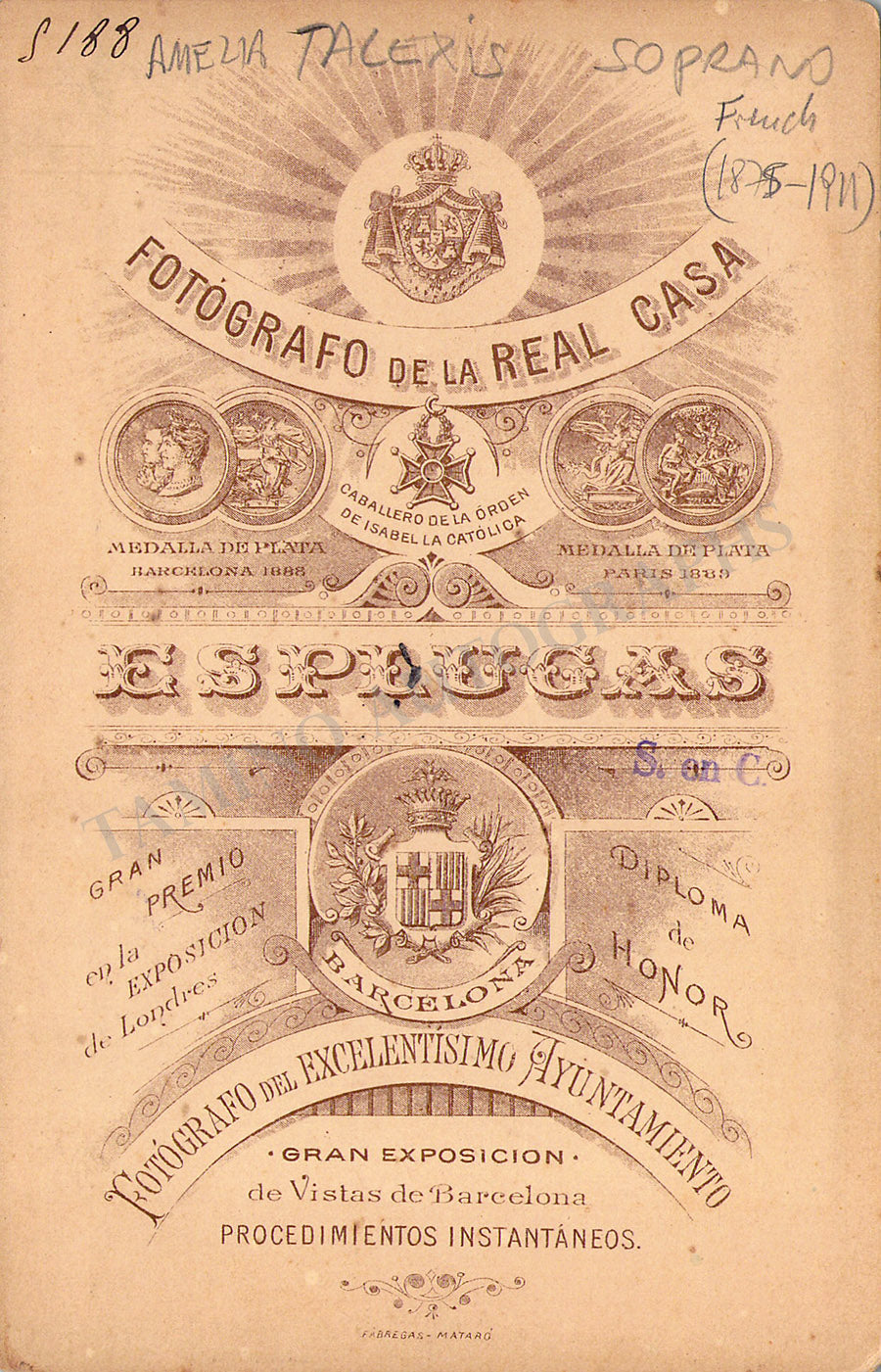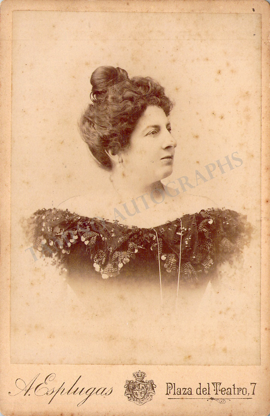 Original cabinet-style vintage (unsigned) photograph of the French singer by photographer Antoni Esplugas (Barcelona). Size is 4.25 x 6.5 inches, spotted rust stains on the front, verso with some ink markings and a small blue ink stamp, otherwise in excellent condition.  Rare!