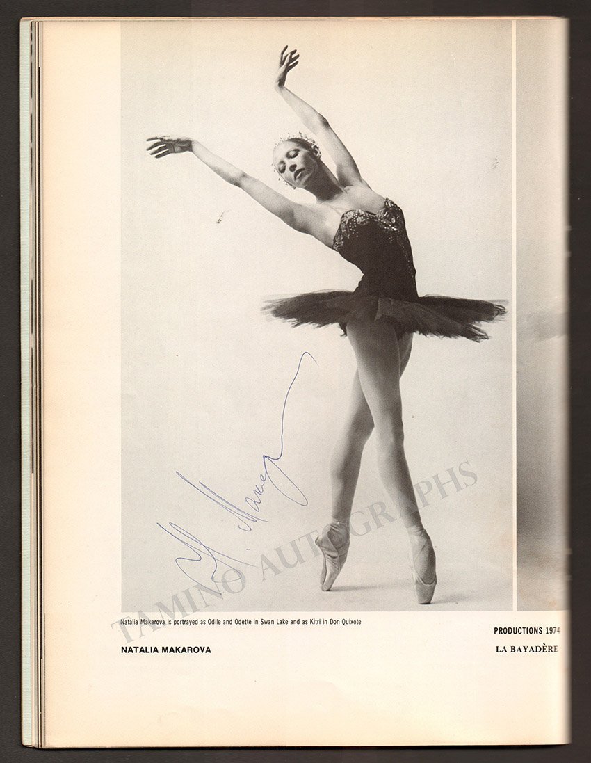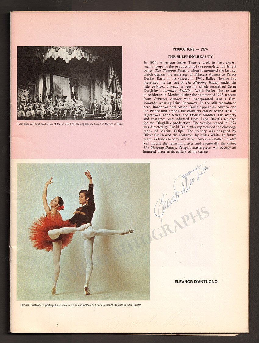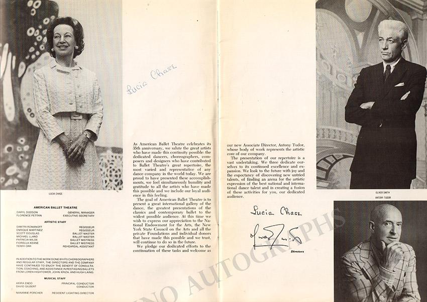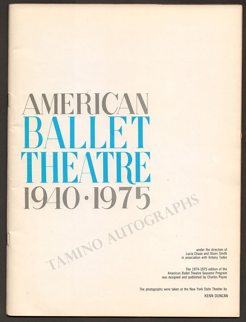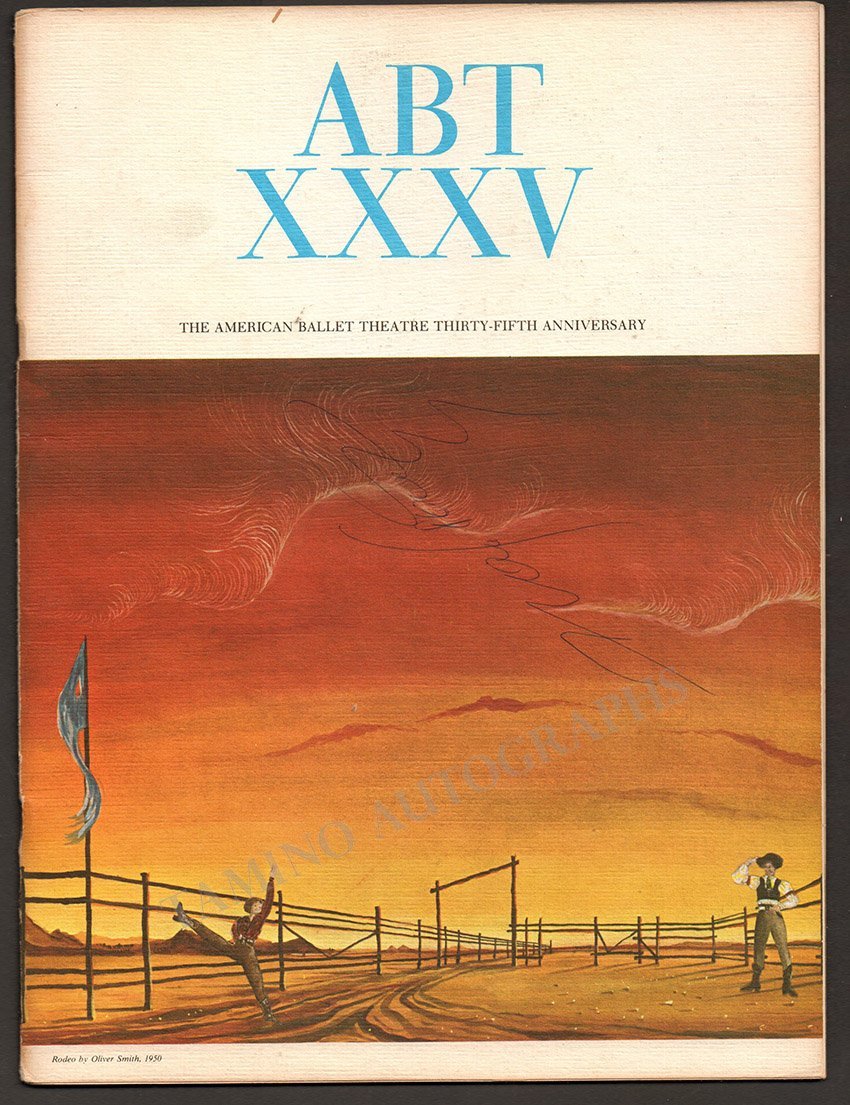 Performance program for the 35th anniversary of the American Ballet Theatre, dated in 1975. Full season program with all pages and covers, including many photos with signatures in some of them, appearing: director Lucia Chase, dancers: Fernando Bujones, Eleanor D’ Antuono, Cynthia Gregory, Jonas Kage, Gelsey Kirkland, Ted Kivitt, Natalia Makarova, Ivan Nagy, Sallie Wilson, Martine van Hamel. Size is 9 x 12 inches, in very good condition.