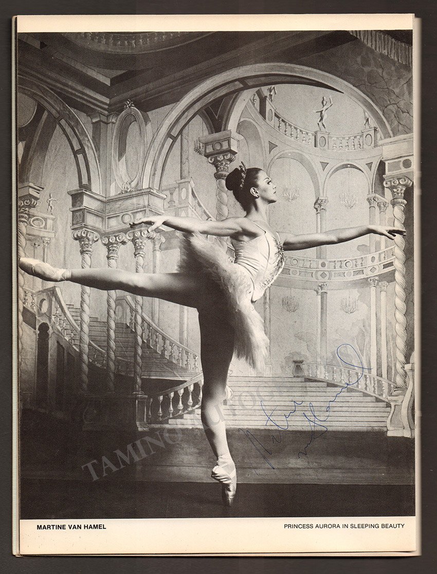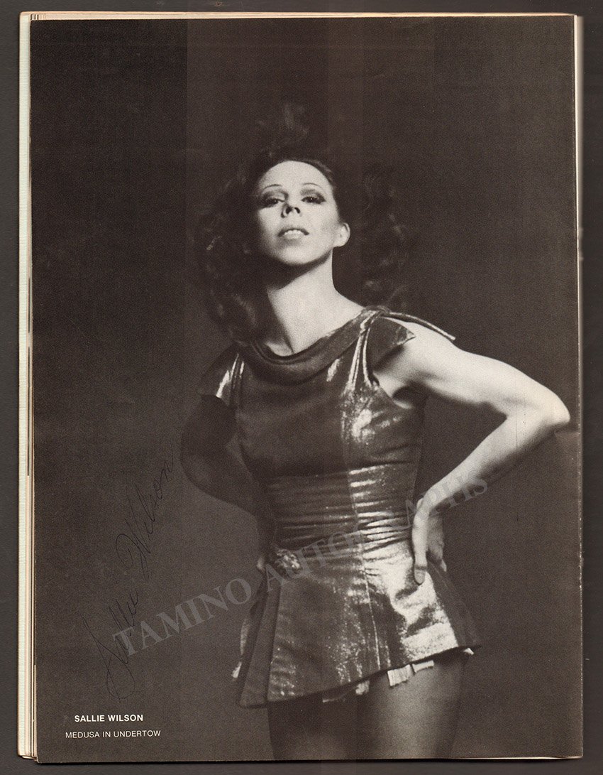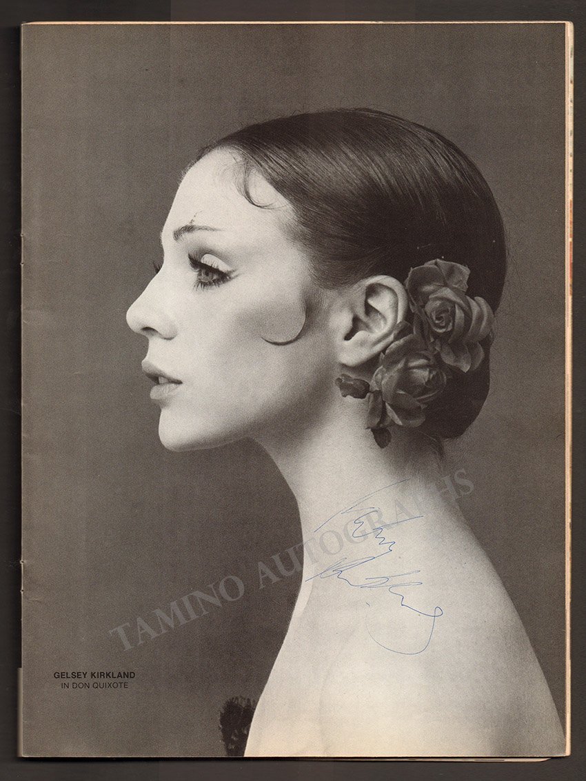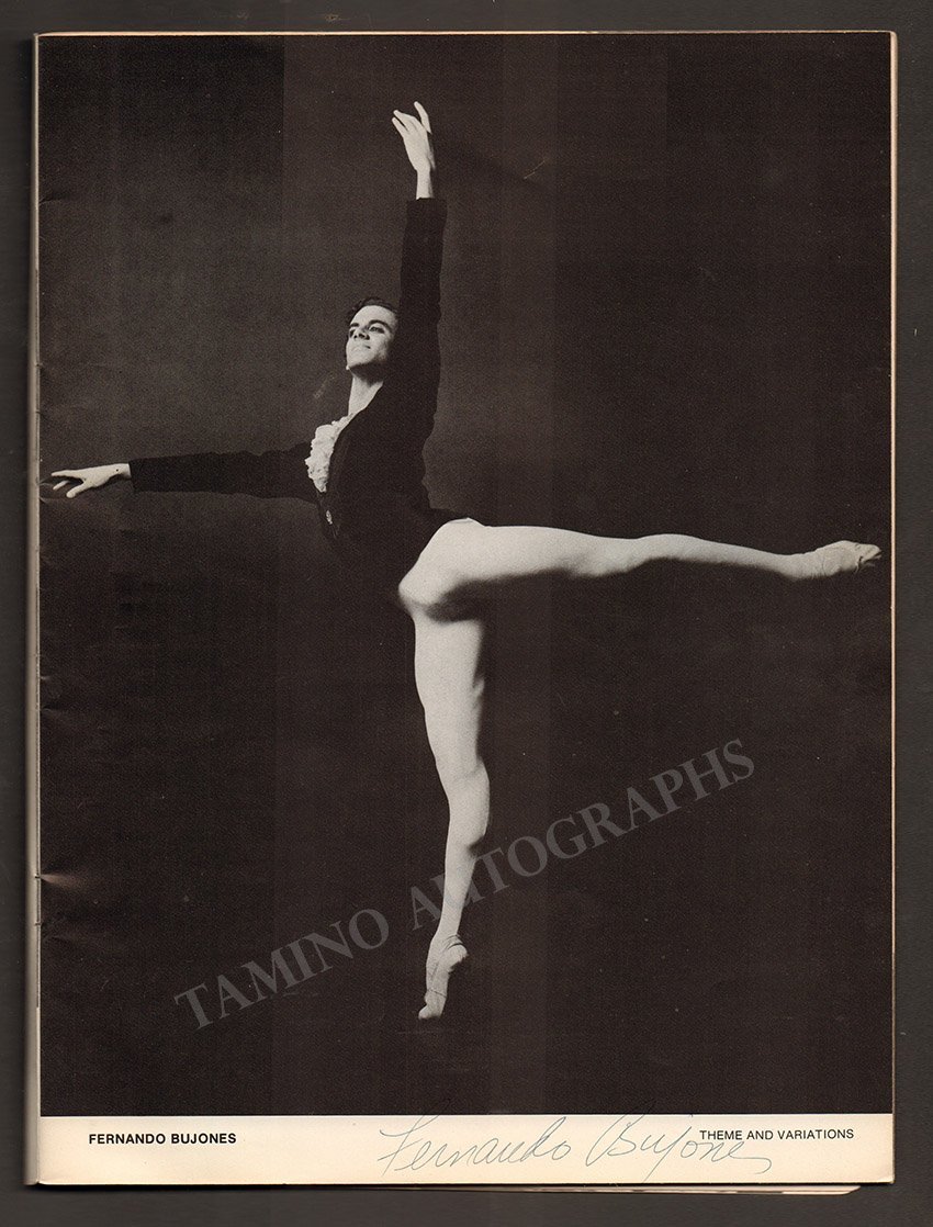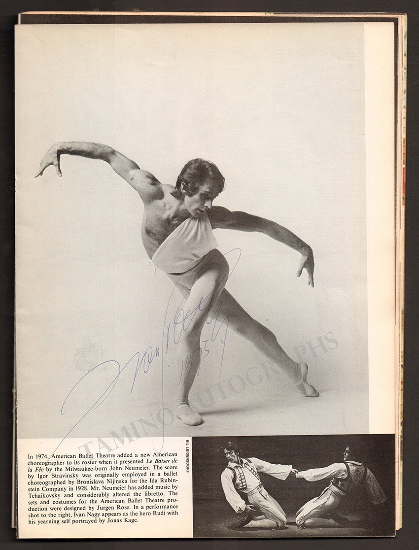 Performance program for the 35th anniversary of the American Ballet Theatre, dated in 1975. Full season program with all pages and covers, including many photos with signatures in some of them, appearing: director Lucia Chase, dancers: Fernando Bujones, Eleanor D’ Antuono, Cynthia Gregory, Jonas Kage, Gelsey Kirkland, Ted Kivitt, Natalia Makarova, Ivan Nagy, Sallie Wilson, Martine van Hamel. Size is 9 x 12 inches, in very good condition.