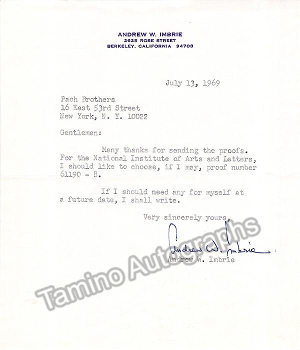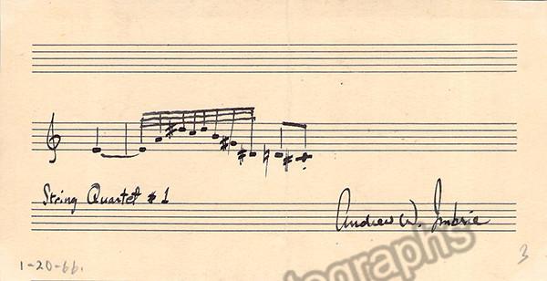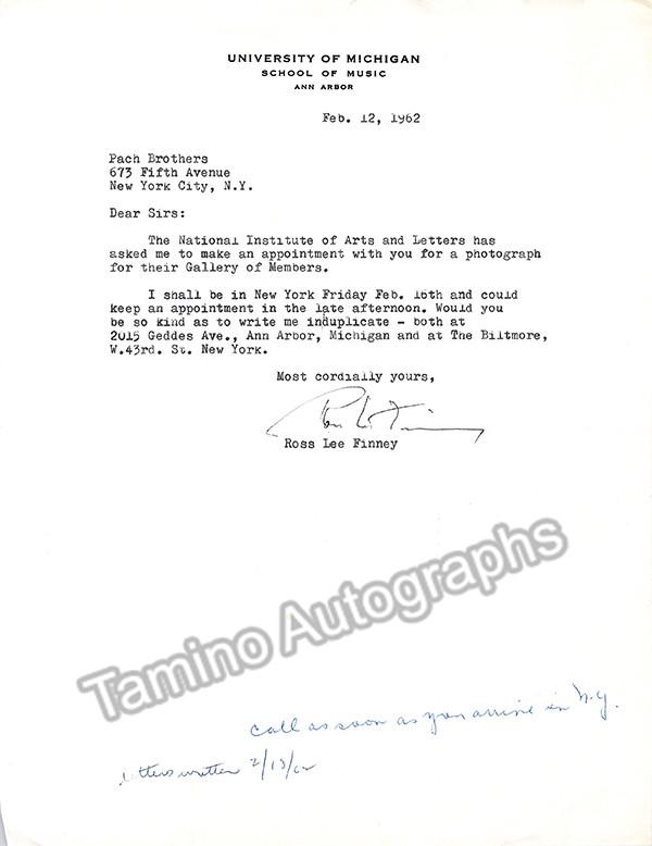Lot of 3 composers: Ross Lee Finner (1906-1997) typed letter signed and dated in 1962; Andrew Imbrie (1921-2007), typed letter signed with letterhead and autograph music quote signed by him of his String Quartet No.1 plus photo; Henry Cowell (1897-1965), teacher, publisher and impresario, autograph letter signed.