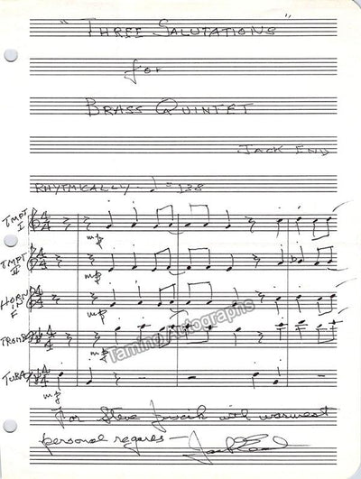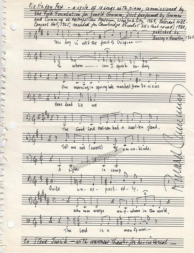 American composer (1919-1986). Autograph music quote with 3 bars of music from this work 'Three Salutations for Brass Quintet' signed and inscribed by him with a short sentiment. Size is 8.25 x 11 inches, in excellent condition.