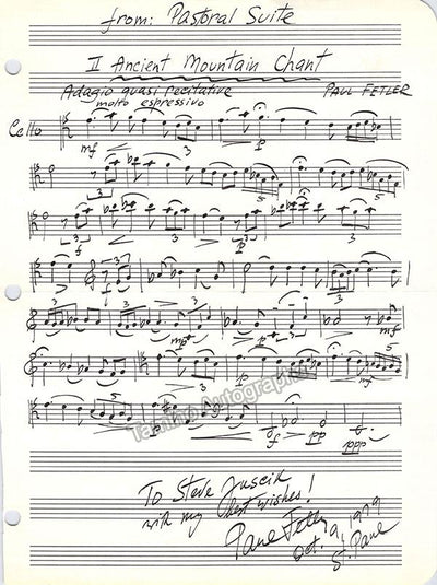 American composer (b.1945) and teacher. Lengthy autograph music quote in pencil from his work 'Three Studies on Flight' signed and inscribed by him, dated in 1982. Size is 8.2 x 11 inches, in excellent condition.