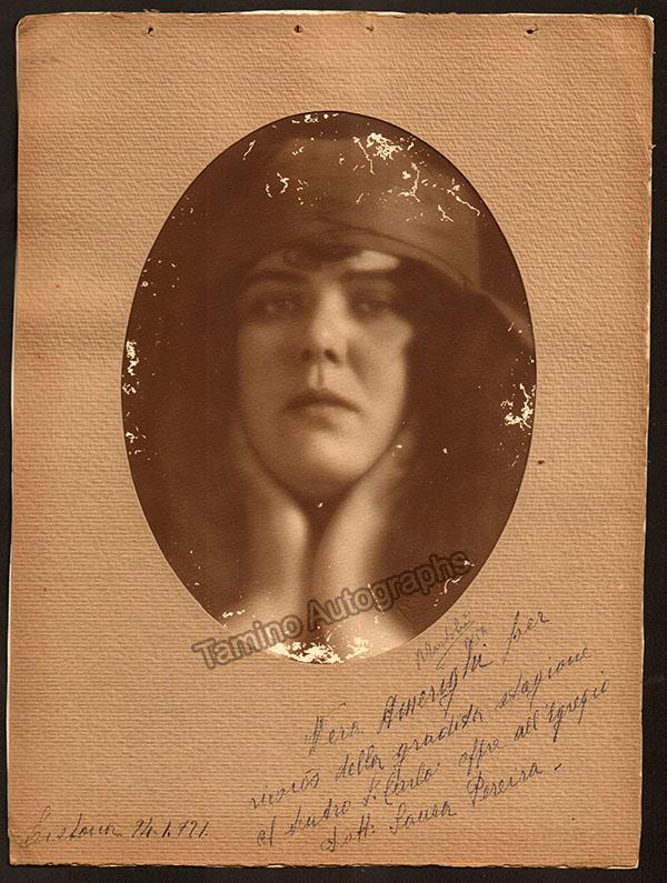Italian soprano (1896-1952), signed photo, shown in role, inscribed and dated in 1921. Also signed in pencil by photographer Martolini, Pisa. Size is 10 x 13.25 inches, small storage holes at the top, some damage on photo image, in good condition.