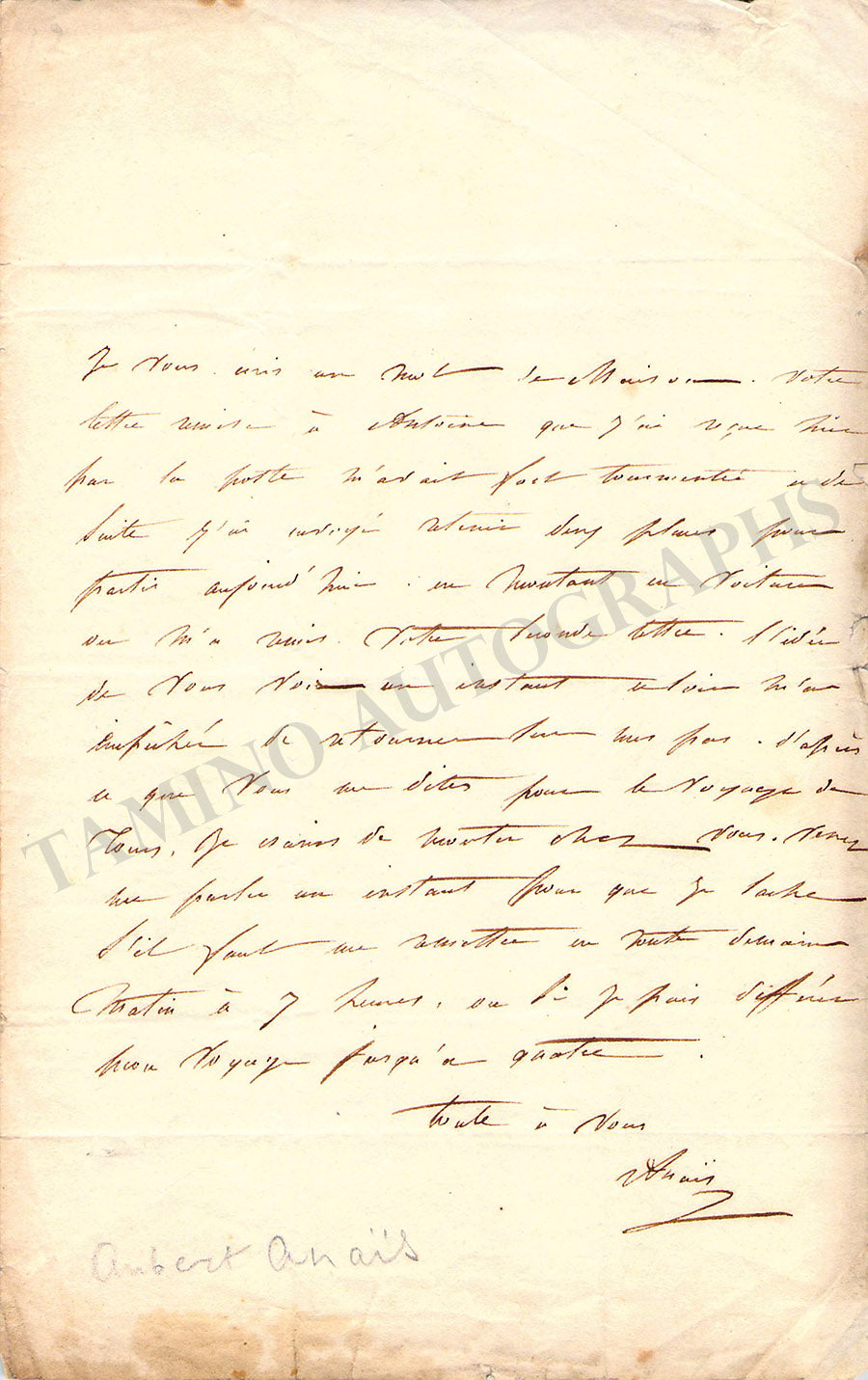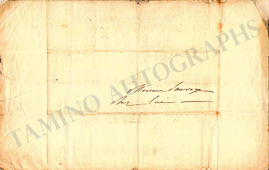 Autograph letter in French signed by her, no date addressed to a certain Monsieur Sauvage, concerning an upcoming meeting. Size is 5 x 8 inches, 1 written page, overall rust tone, folds, in overall very good condition.