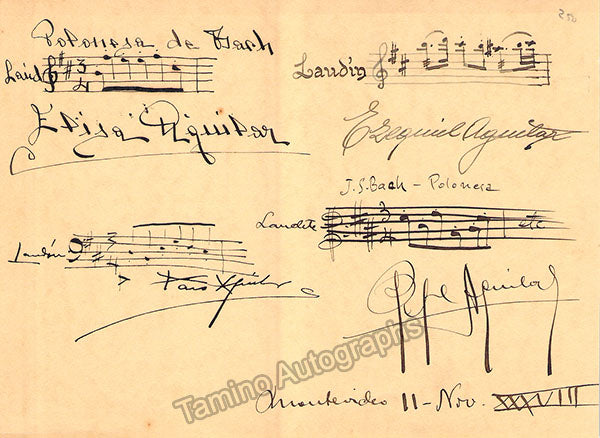 Also included: verso page contains 4 signatures and accompanying musical quotes by all 4 members of the Aguilar Quartet, a famous Spanish Lute quartet that performed on tour in the 1920s and 30s, dated in 1938. Size is 5.75 x 7.75 inches, in excellent condition.