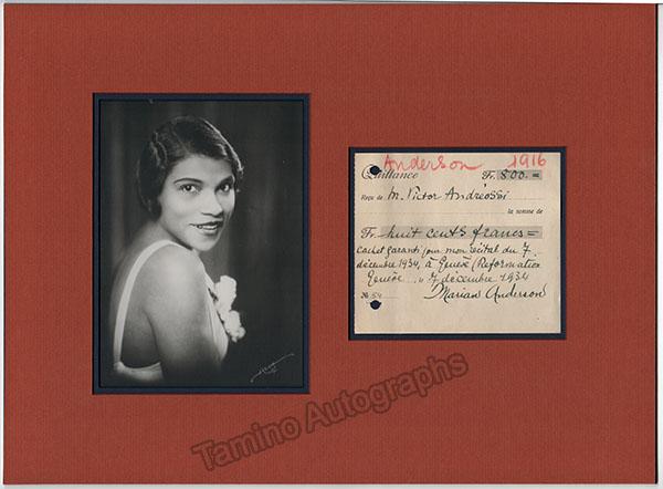 Signed receipt for the payment of a recital on December 7th, 1934 in Geneve, Switzerland; nicely matted with a photo of her shown young.  Total mat size is 15.25 x 11.3 inches, receipt is 4.75 x 4.25 inches (storage holes), photo is 4.75 x 6.7 inches (visible window size), all in excellent condition.