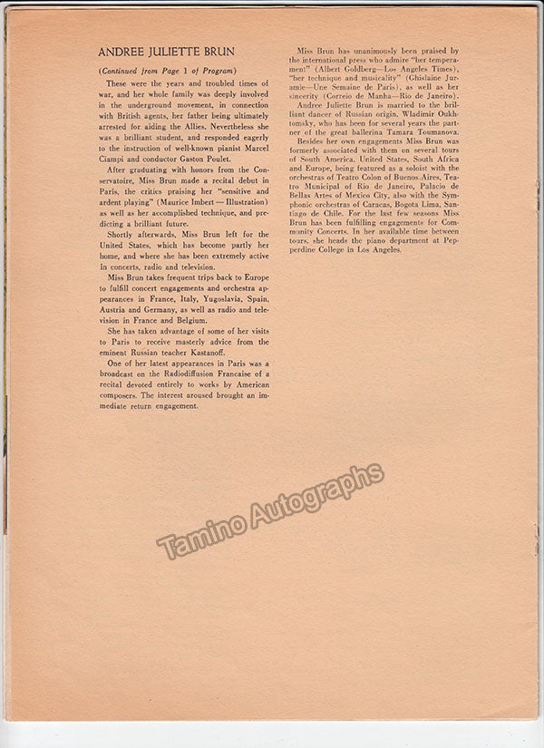 Brun, Andree Juliette - Signed Program New York 1965