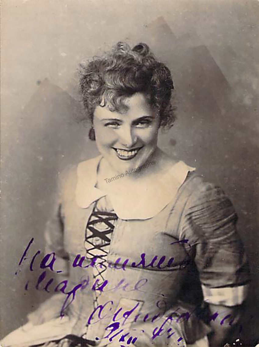 Russian actress (1898-1975). Beautiful black and white photograph signed by her with a short sentiment, dated in 1944, shown in role. Size is 3.5 x 4.7 inches, in very good condition.
