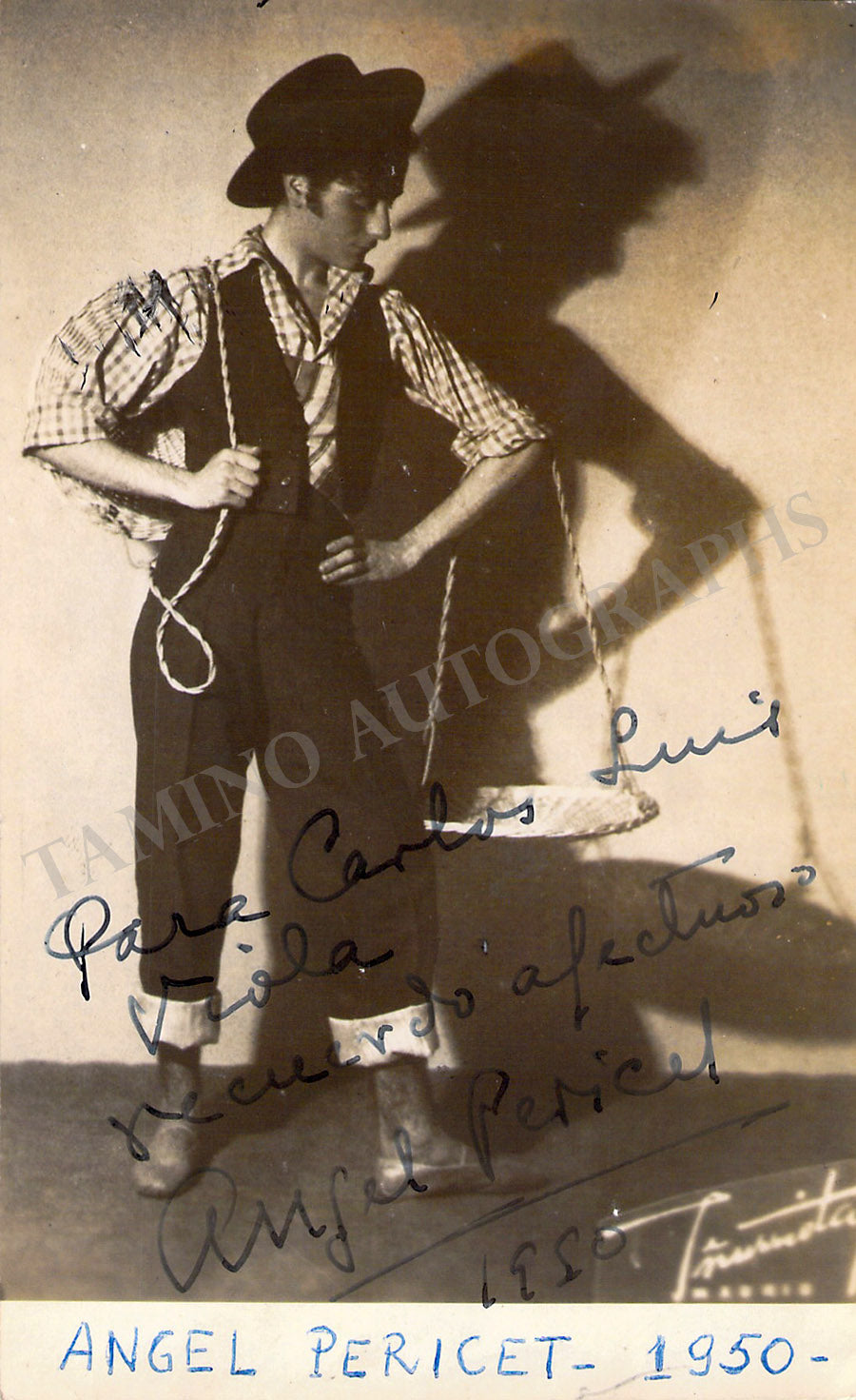 Fine black-and-white photograph signed and inscribed by him with a short sentiment dated 1950, here shown in costumes; ink-stamped on verso by photographer Carmen (Buenos Aires). Size is 3.5 x 5.75 inches, in excellent condition.