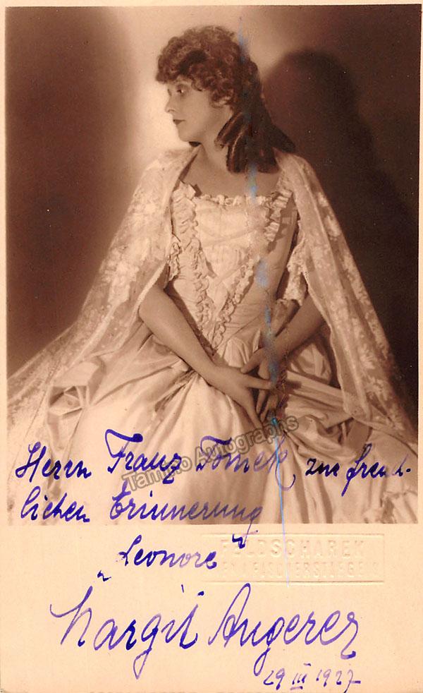 Hungarian soprano (1895-1978), signed photo postcard, shown in role, inscribed and dated in 1927. Blind stamped by Feldscharek photographers. Size is 3.25 x 5.25 inches, in excellent condition.