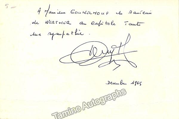 French baritone and later tenor (b. 1932), signed photo, shown as himself. Signature and inscription on verso, dated in 1965. Size is 3.75 x 5.75 inches, slight wear on edges but otherwise in very good condition.