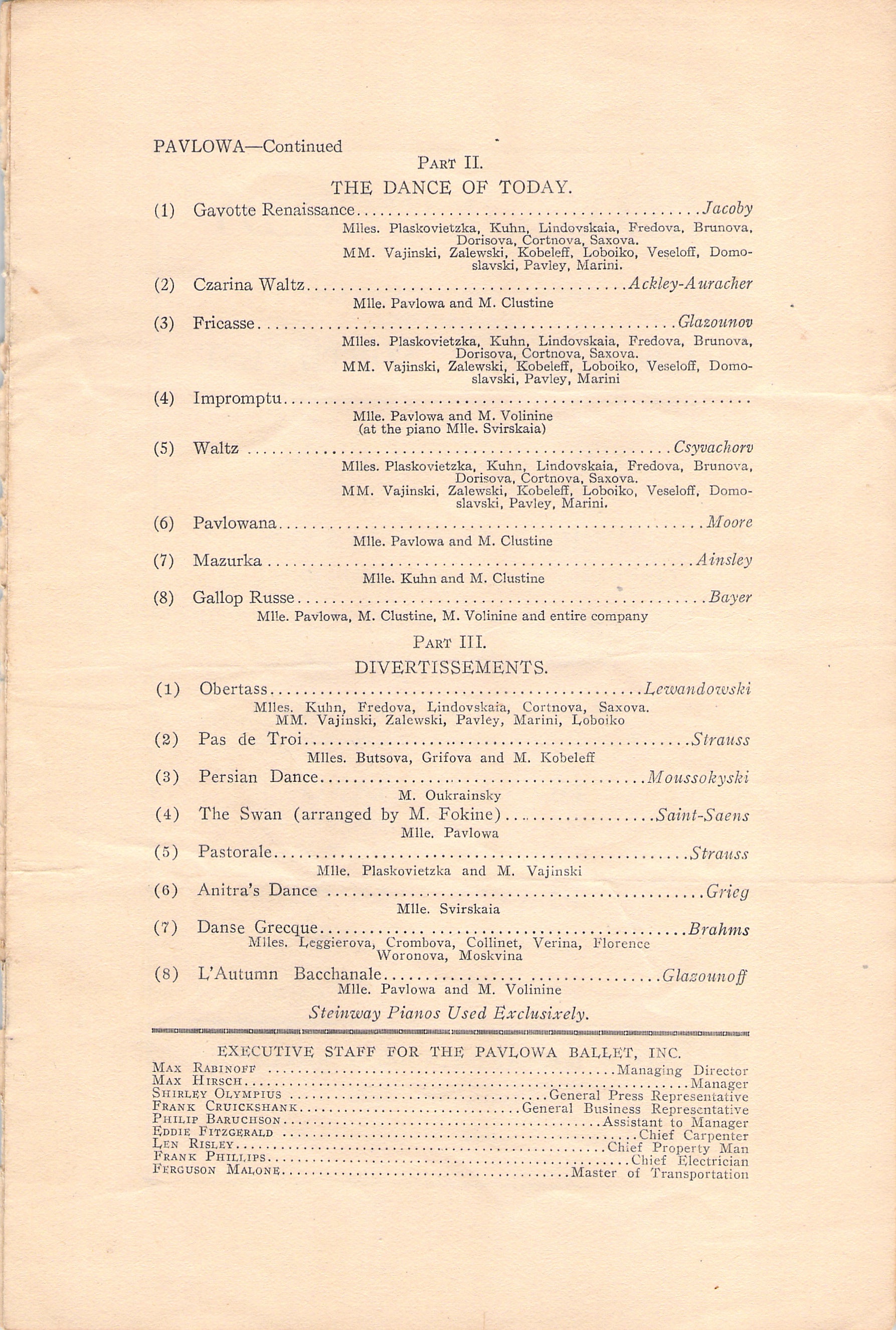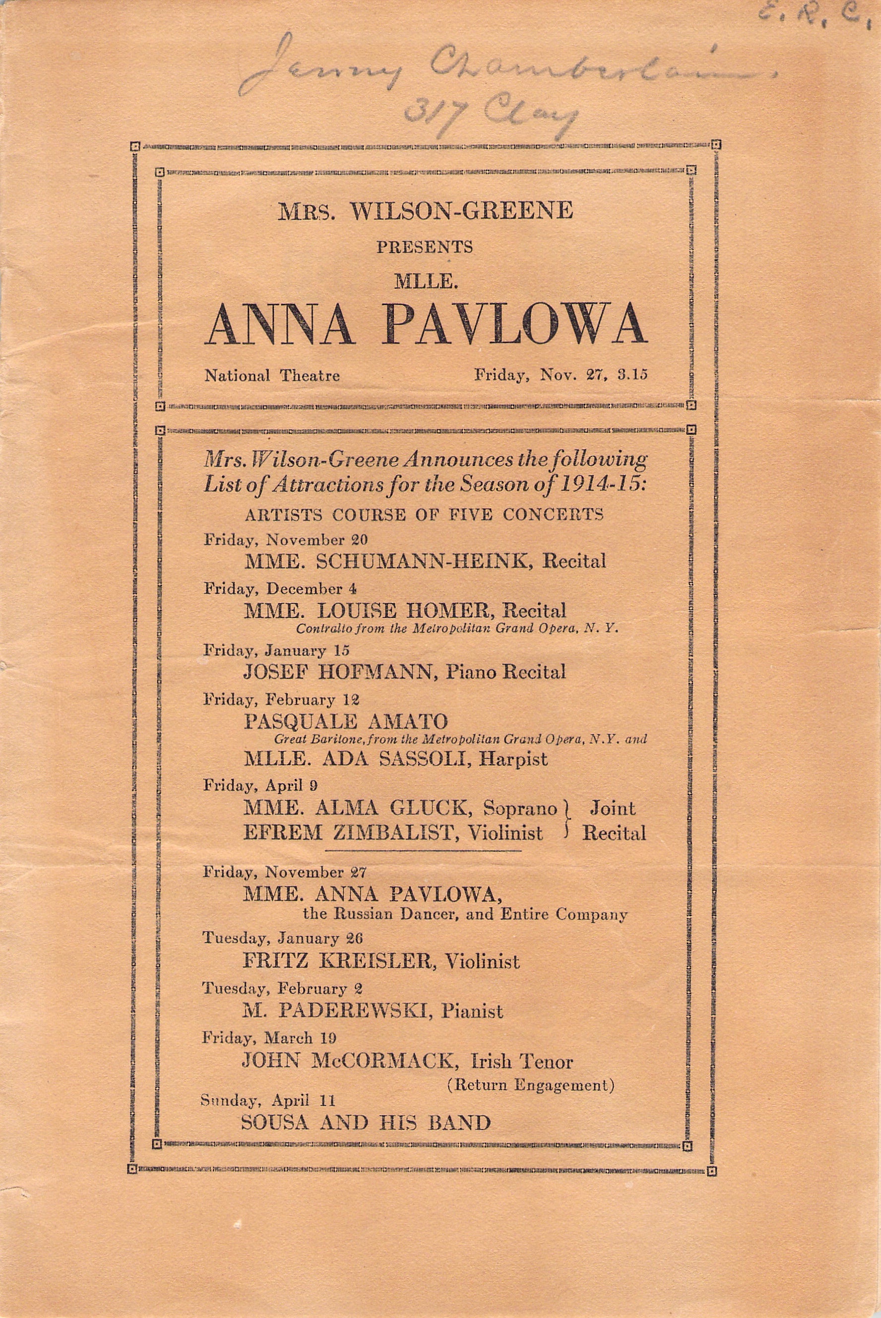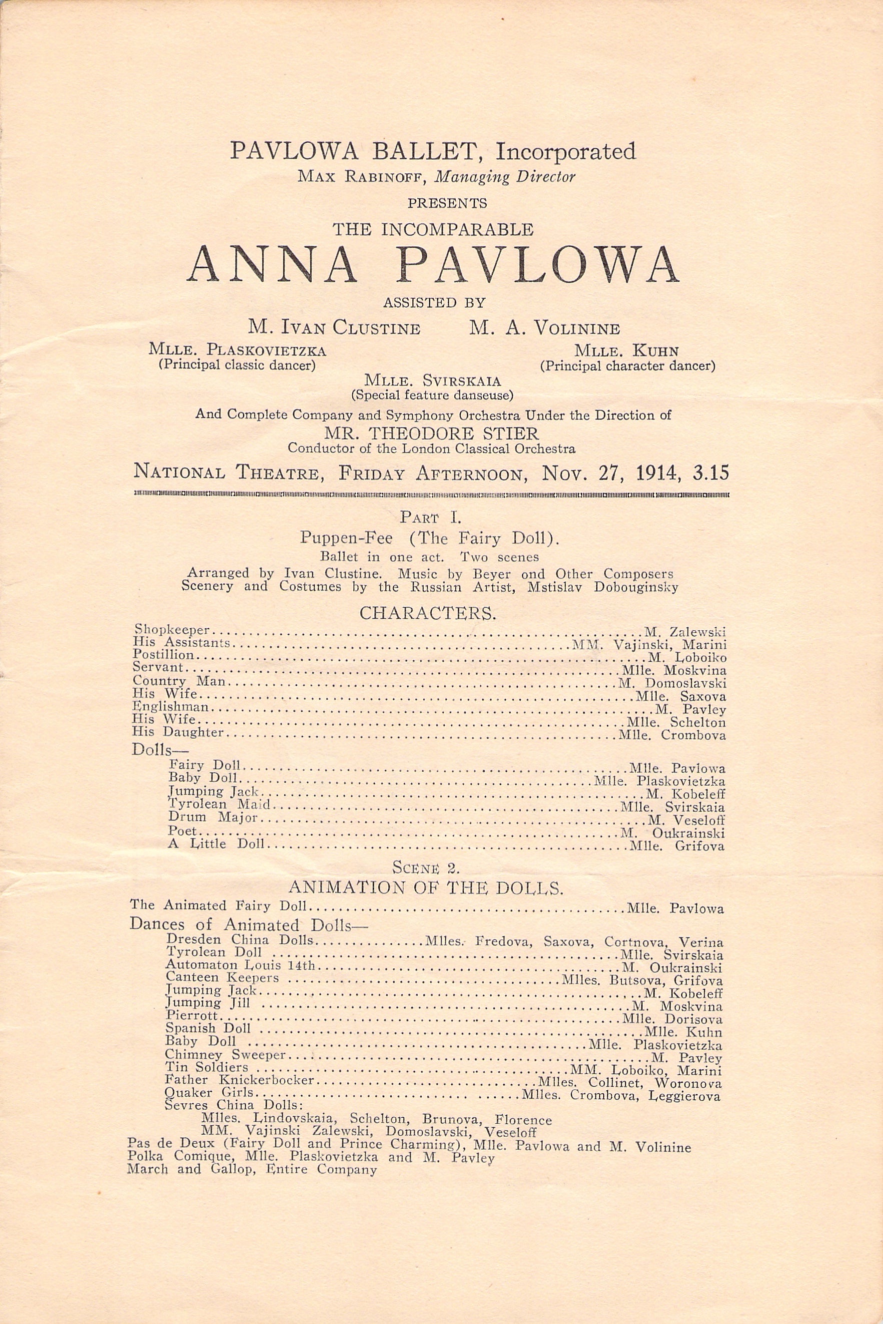 Program for a performance of the ballet "The Fairy Doll" by the star Russian ballerina and her company at The National Theatre, Washington, on November 27, 1914.  Size is 6 x 8.9 inches, 8 pages (including covers), rust stains on the front cover, inside in very good condition.