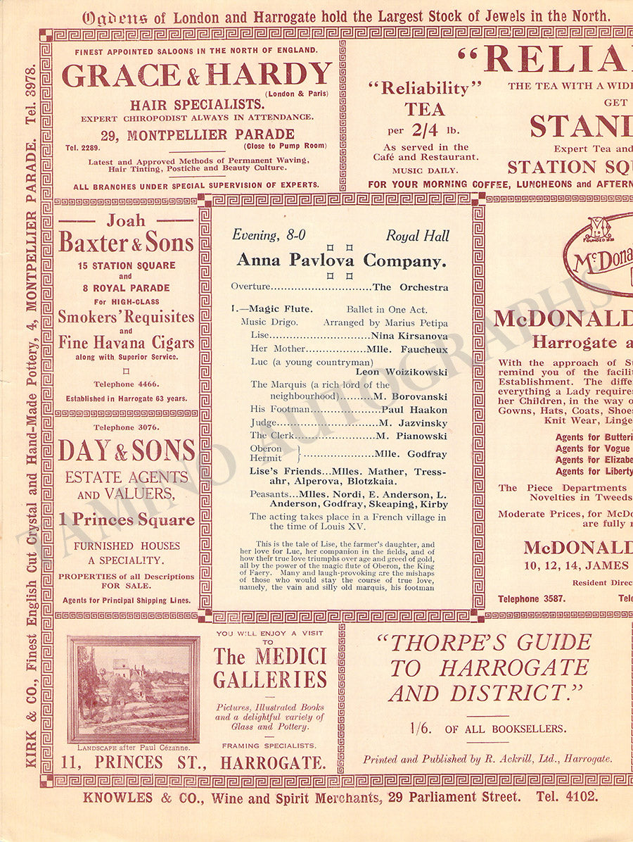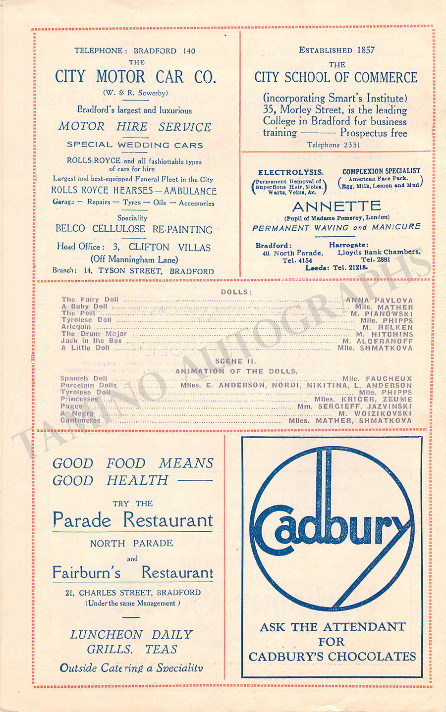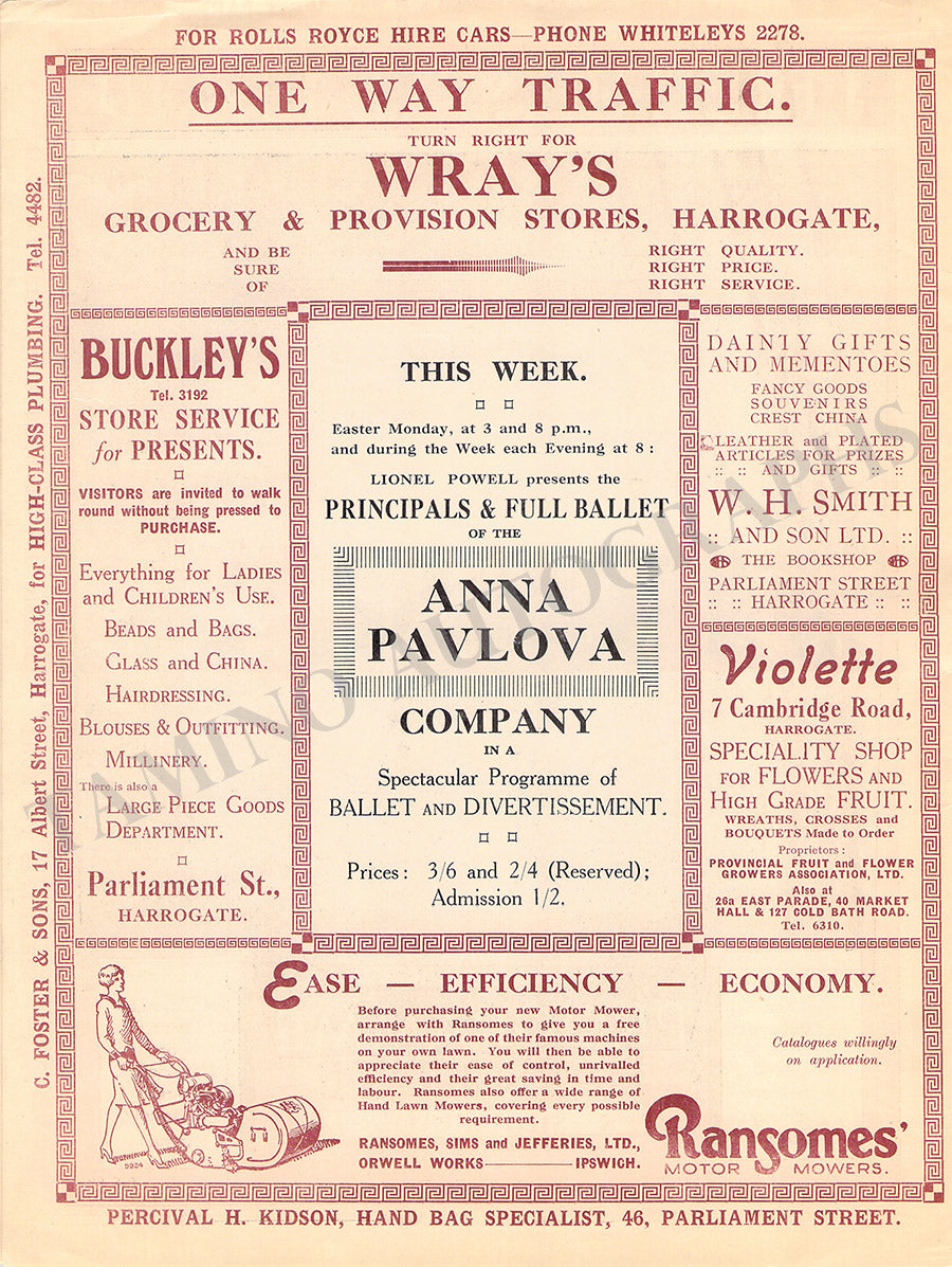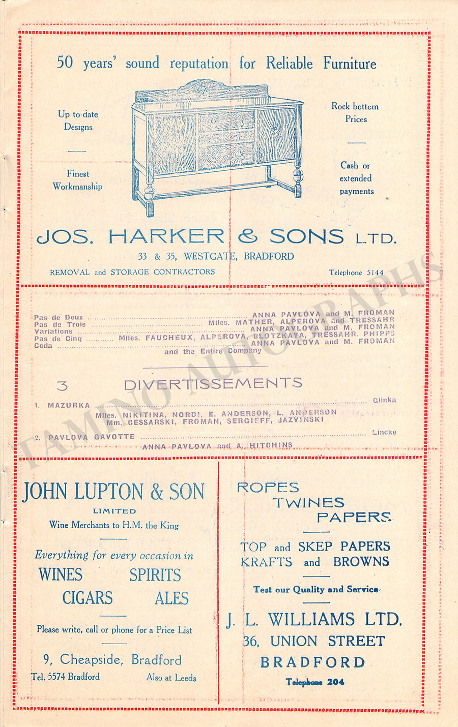 Original program for a performance in Leeds on October 13, 1930, featuring the star ballerina. Size is 5.5 x 8.4 inches, full program with all pages and covers, in excellent condition.