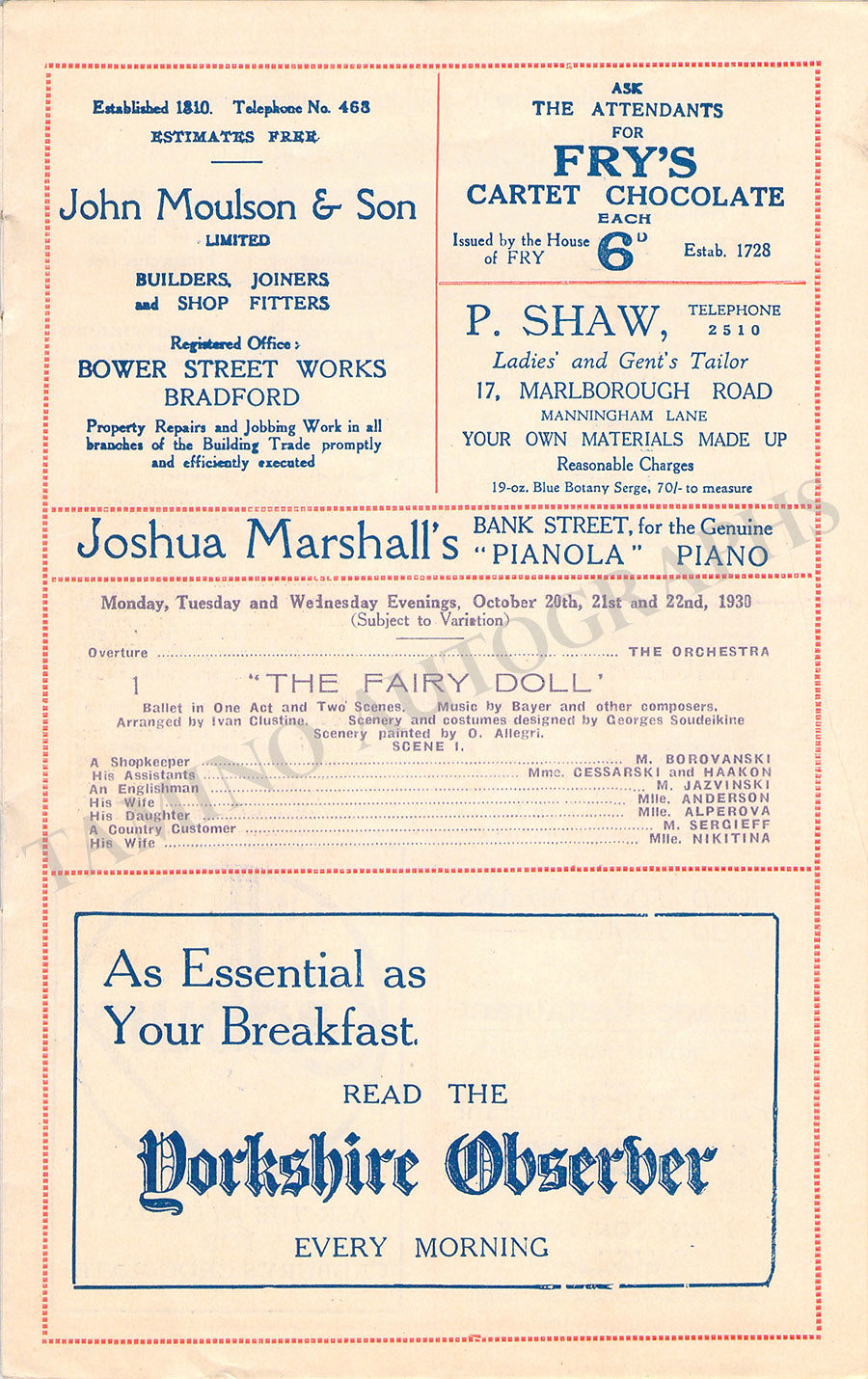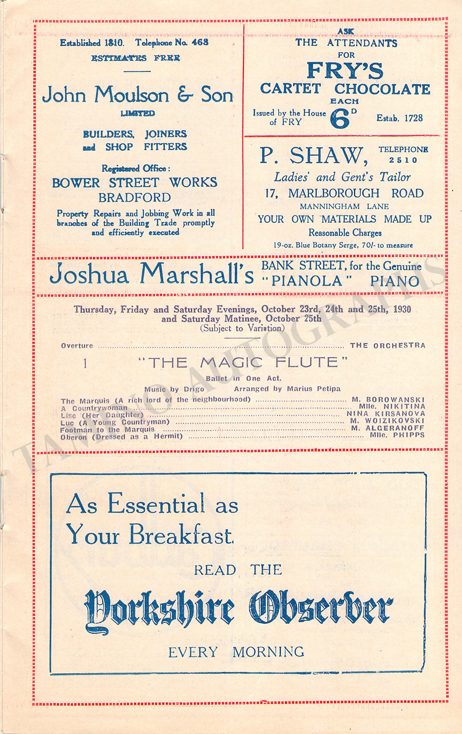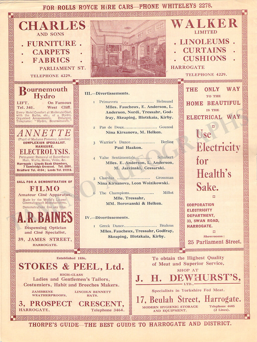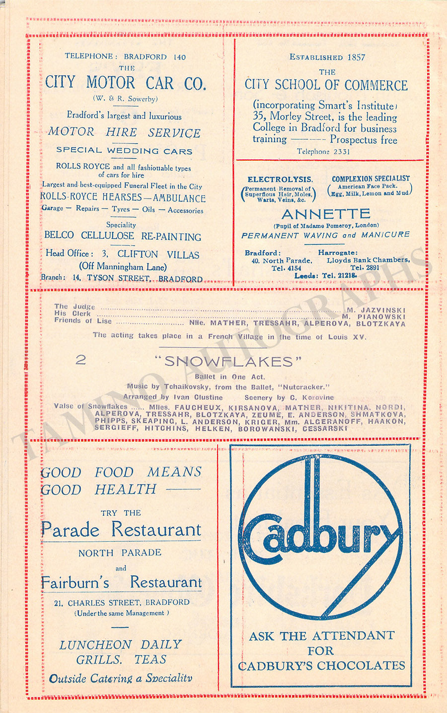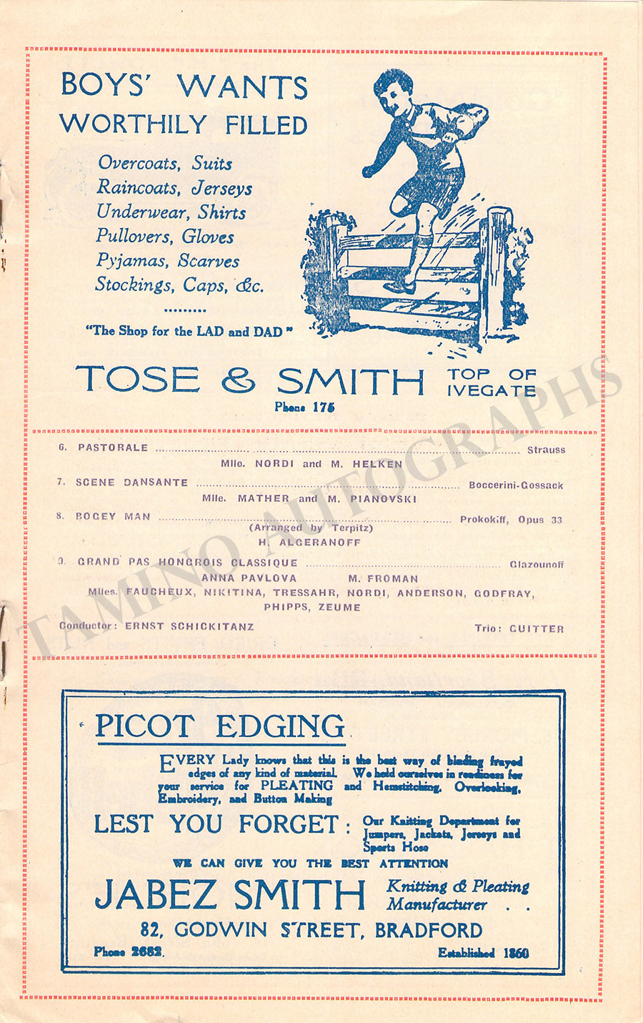 Original program for a performance in Leeds on October 13, 1930, featuring the star ballerina. Size is 5.5 x 8.4 inches, full program with all pages and covers, in excellent condition.