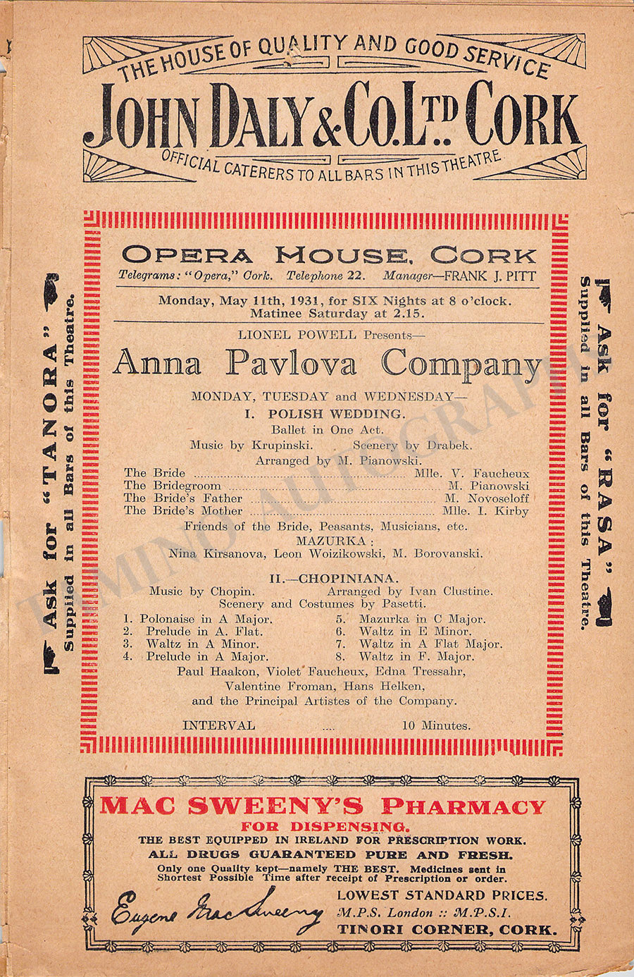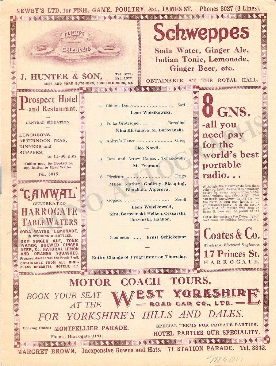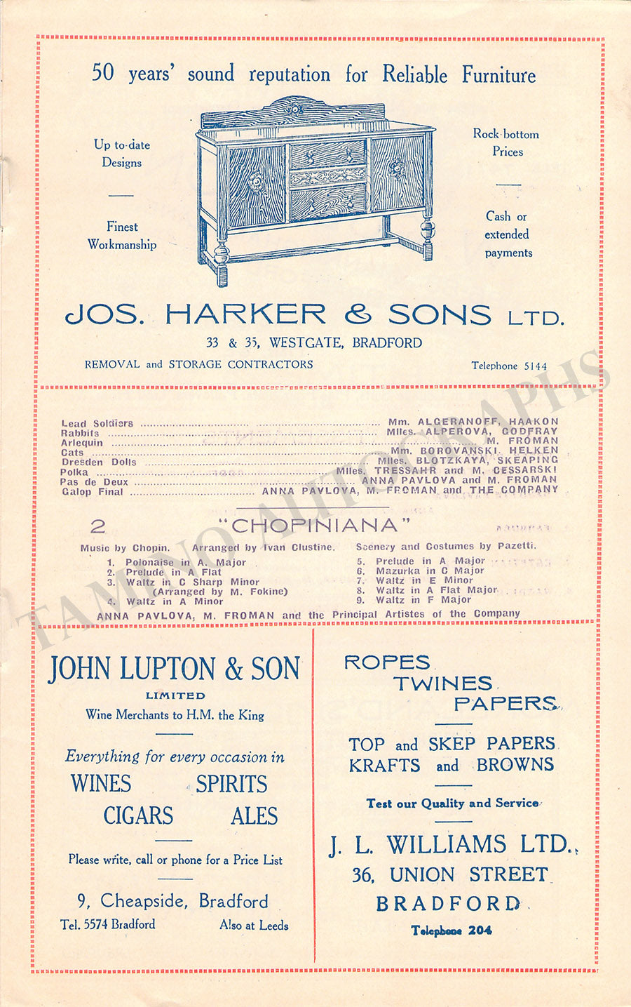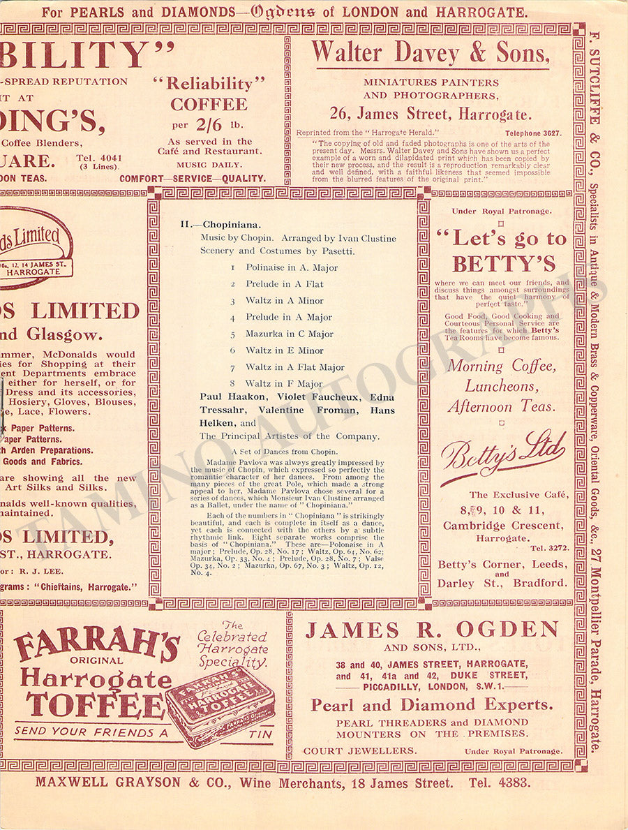 Original program for a performance in Leeds on October 13, 1930, featuring the star ballerina. Size is 5.5 x 8.4 inches, full program with all pages and covers, in excellent condition.