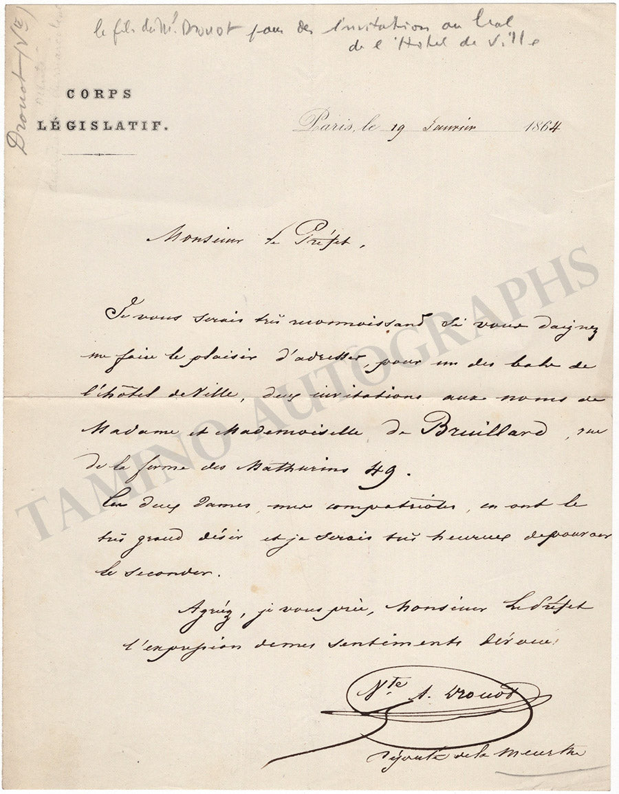Autograph letter in French (untranslated) signed by him, dated in Paris, January 19, 1864, addressed to the Prefect, asking for two invitations for a Bal at the Hôtel de Ville for “…Madame et Mademoiselle de Bruillard…”.