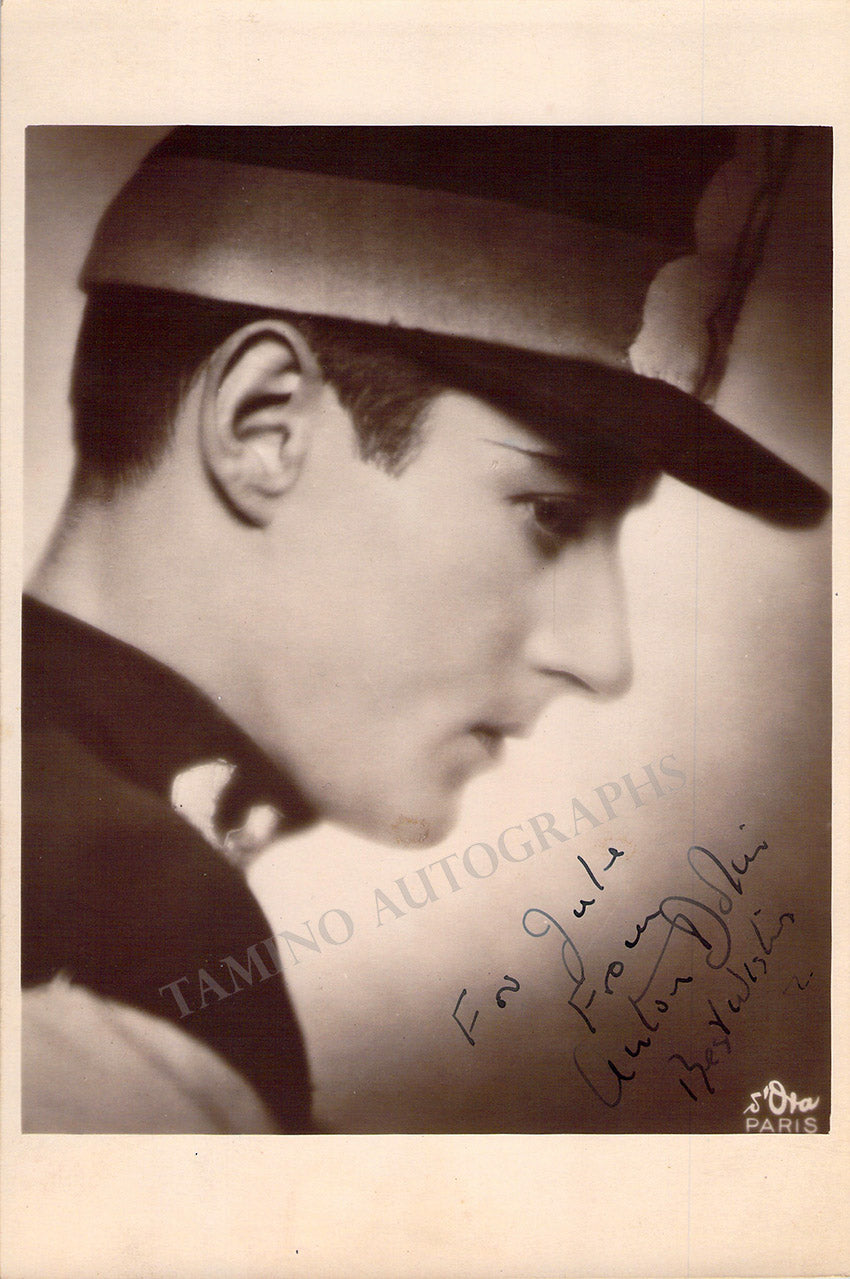 Large black-and-white photograph signed by him, shown dancing; blind-stamped over the lower-right corner by photographer S. Georges (London) and also ink-stamped on verso as well. Size is 8.5 x 10.75 inches, minor cracks on borders, creases, in overall very good condition.