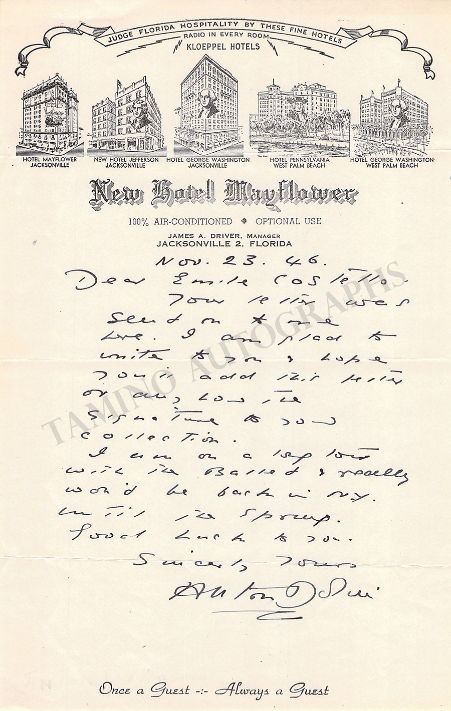 ALSO INCLUDED is a 1-page autograph letter about personal matters signed by him, with the letterhead of the Mayflower Hotel. Size is 6 x 9.5 inches, folds, otherwise in excellent condition.