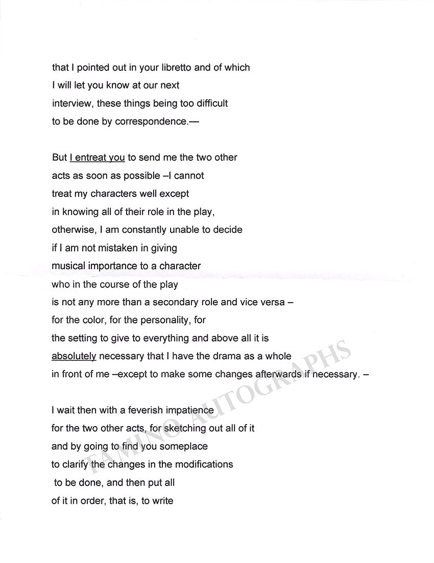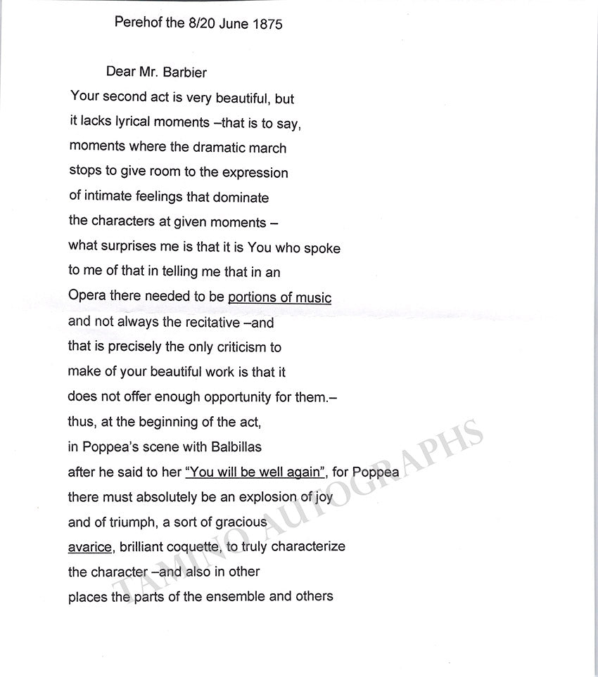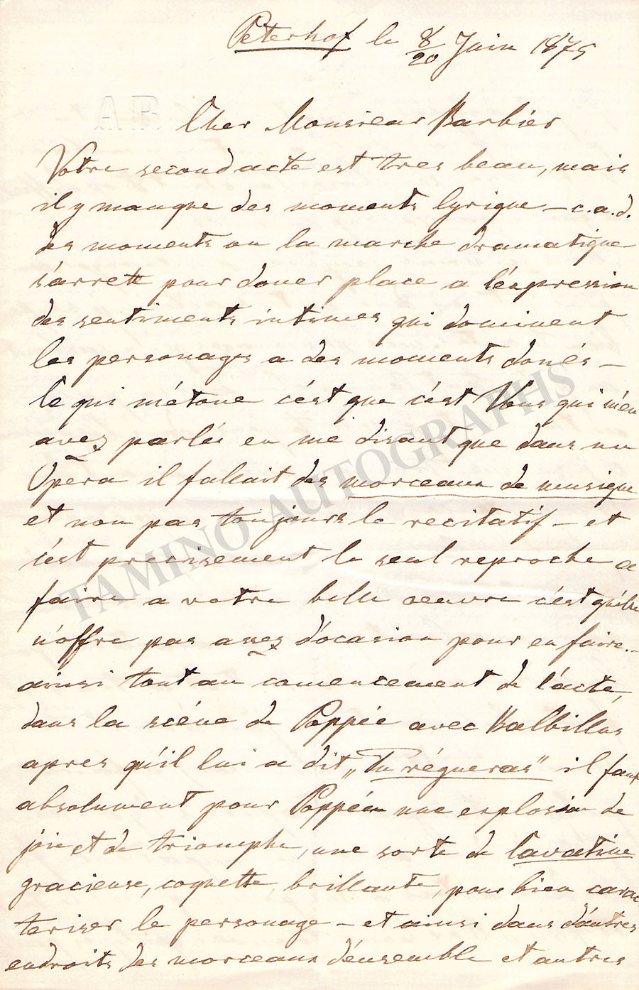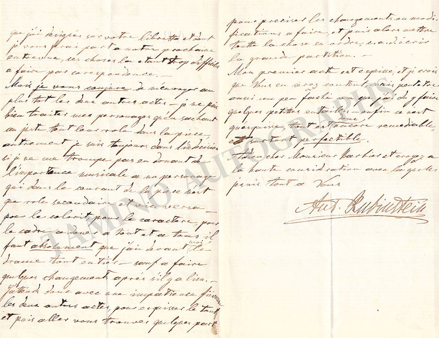Autograph letter in French (sold with translation) signed by him, dated in Peterhof, June 8, 1875, addressed to his librettist Jules Barbier about Rubinstein's opera "Nero".  Size is 5.25 x 8.2 inches, 3 pages, folds, in excellent condition.
