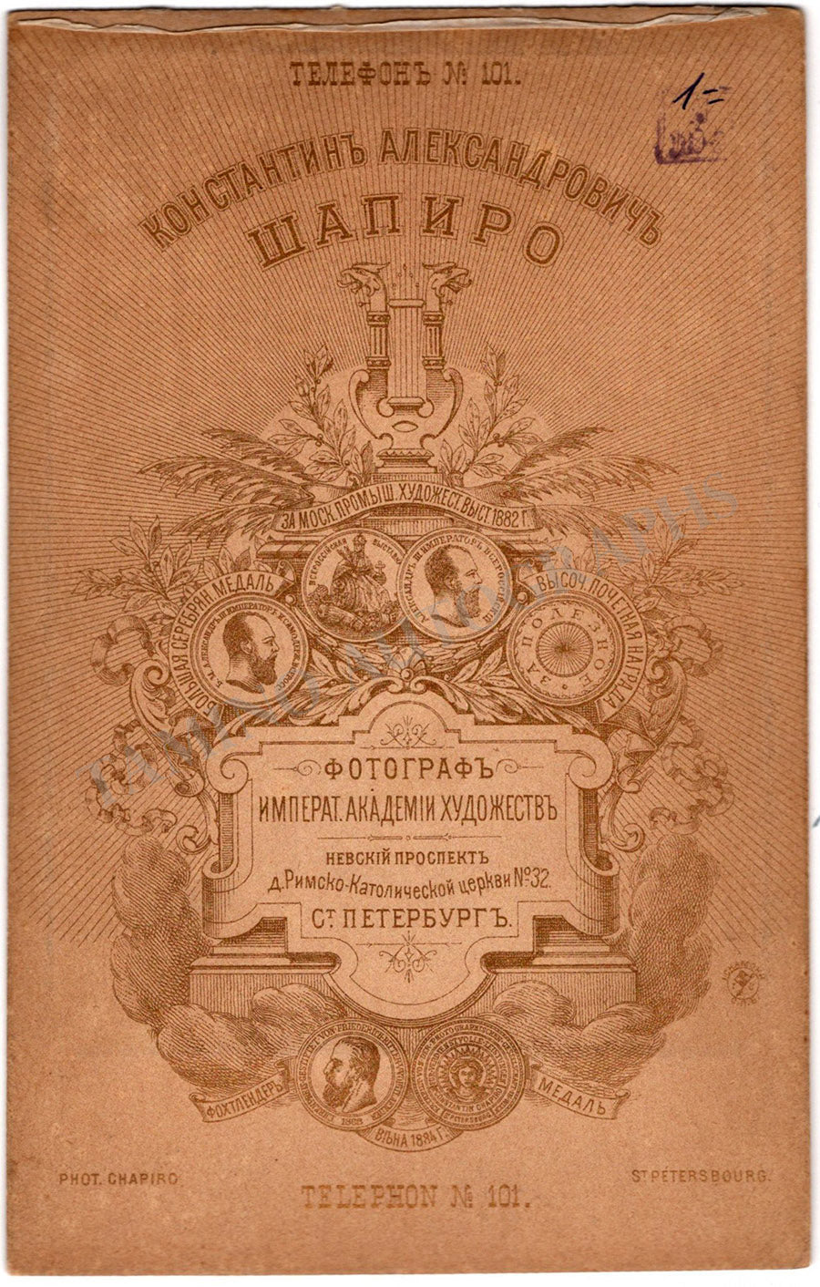 Unsigned cabinet photograph of the pianist by photographer K. Shapiro (St. Petersbourg).  Size is 4.25 x 6.7 inches, some ink and pencil markings on verso, otherwise in excellent condition.