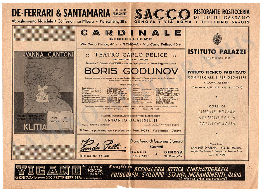 Half-tone photograph (a page from a program for a performance of Mussorgsky's "Boris Godunov" in 1940 signed and inscribed by Guarnieri with a short sentiment. Size is 6.25 x 9.2 inches, minor damage over the bottom, in overall good condition.